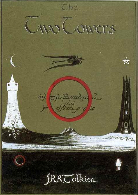 compromesso, visto che Il Signore degli Anelli non era una trilogia, ma un libro unico. L’autore si rendeva anche conto che c’era un’evidente confusione, perché «in realta’, naturalmente, non c’e’ nessun vero legame fra i Libri III e IV» e «dato che si parla così tanto dell’opposizione tra la Torre Nera e Minas Tirith, tutto diventa confuso». D’altra parte, nel suo disegno originario per la copertina delle Due Torri (Lettere, n. 151), le torri sono sicuramente Orthanc e Minas Morgul. Orthanc è disegnata in nero, con tre punte (come si può vedere ance nel libro Immagini di Tolkien, illustrazione n. 27, qui a sinistra) e con il segno della Mano Bianca accanto; Minas Morgul è una torre bianca, con un sottile spicchio di luna sopra, in riferimento al suo nome originario; Minas Ithil, la torre della luna crescente (La Compagnia dell’Anello, pag. 257). Tra le due torri vola un Nazgul.