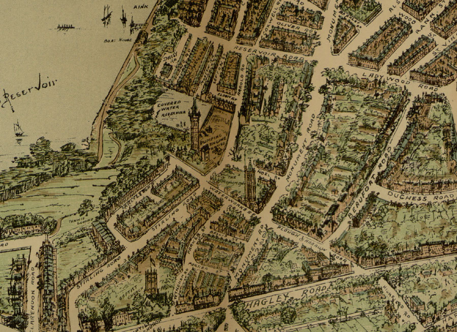 Tolkien visse la sua infanzia in un sobborgo semi-rurale di Birmingham (presso il quale sorgono il boschetto e l’acquitrino di Moseley Bog, oggi feticizzati dai fan, come si può leggere qui). Sua madre, Mabel, si trasferì con lui e il fratello Hilary dal sobborgo di King’s Heath a quello di Edgbaston nella primavera del 1902. Edgbaston, a circa due miglia dal centro, era visto come il miglior sobborgo di Birmingham: sicuramente quasi tutte le case avevano un giardino e c’era un grande parco dove spesso si svolgevano spettacoli e un lago su cui si andava in barca. In un primo momento vissero in Oliver Road (nella parte superiore della mappa), comoda per i ragazzi perché la scuola che frequentavano in quel momento, la St. Philip’s School, era nella stessa strada. Dopo la morte della madre, i due fratelli Tolkien vissero con la zia Beatrice Suffield (dal 1905 al 1908), vedova del fratello minore di Mabel, in Stirling Road (in basso a sinistra). I due fratelli non erano, però, a loro agio e così il loro tutore, padre Francis Morgan, gli trovò un nuovo alloggio presso i Faulkners, al 37 di Duchess Road (a destra della mappa). Tuttavia, l’opposizione alla relazione tra lo scrittore e Edith Bratt (sua futura moglie) spinse il tutore a cambiare ancora: nel 1910 i due fratelli Tolkien dovettero trasferirsi in un alloggio a Highfield Road (subito a sud della Hagley Road, non nella mappa), molto vicino all’Oratorio di San Filippo Neri di Hagley Road, dove insegnava padre Morgan. Come si vede nella mappa, tutta la zona di Edgbaston viveva all’ombra della Perrott’s Folly e della torre vittoriana dell’acquedotto di Edgbaston, le due torri che avrebbero influenzato le immagini delle torri scure all’interno delle sue opere. Si può dire che Tolkien le conoscesse bene, ma dire che ne fu influenzato è un po’ troppo. Lo scrittore, infatti, non ne parlò mai. Lo scrittore amava la vegetazione in tutte le sue forme e cullò sempre l’immagine di un’infanzia bucolica rispetto all’adolescenza urbana, tra smog, industrie e traffico. In realtà, studiosi come Tom Shippey e Maggie Burns, vissuti negli stessi luoghi danno una versione differente: i sobborghi e la campagna di Birmingham non erano così nettamente contrapposte come sembra, ma si passava lentamente dall’una all’altra.