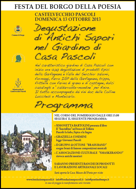 gruppo di ottoni Brass Band che eseguirà brani di famose composizioni musicali. Per l’evento l’associazione culturale Smaskerando proporrà rappresentazioni di antichi mestieri. Ma il clou della giornata sarà la presentazione del libro di Simonetta Bartolini, Il fanciullino nel bosco di Tolkien. Pascoli: la fiaba, l’epica, la lingua (casa editrice Polistampa, 80 pp., 8 euro), ad opera della stessa autrice.