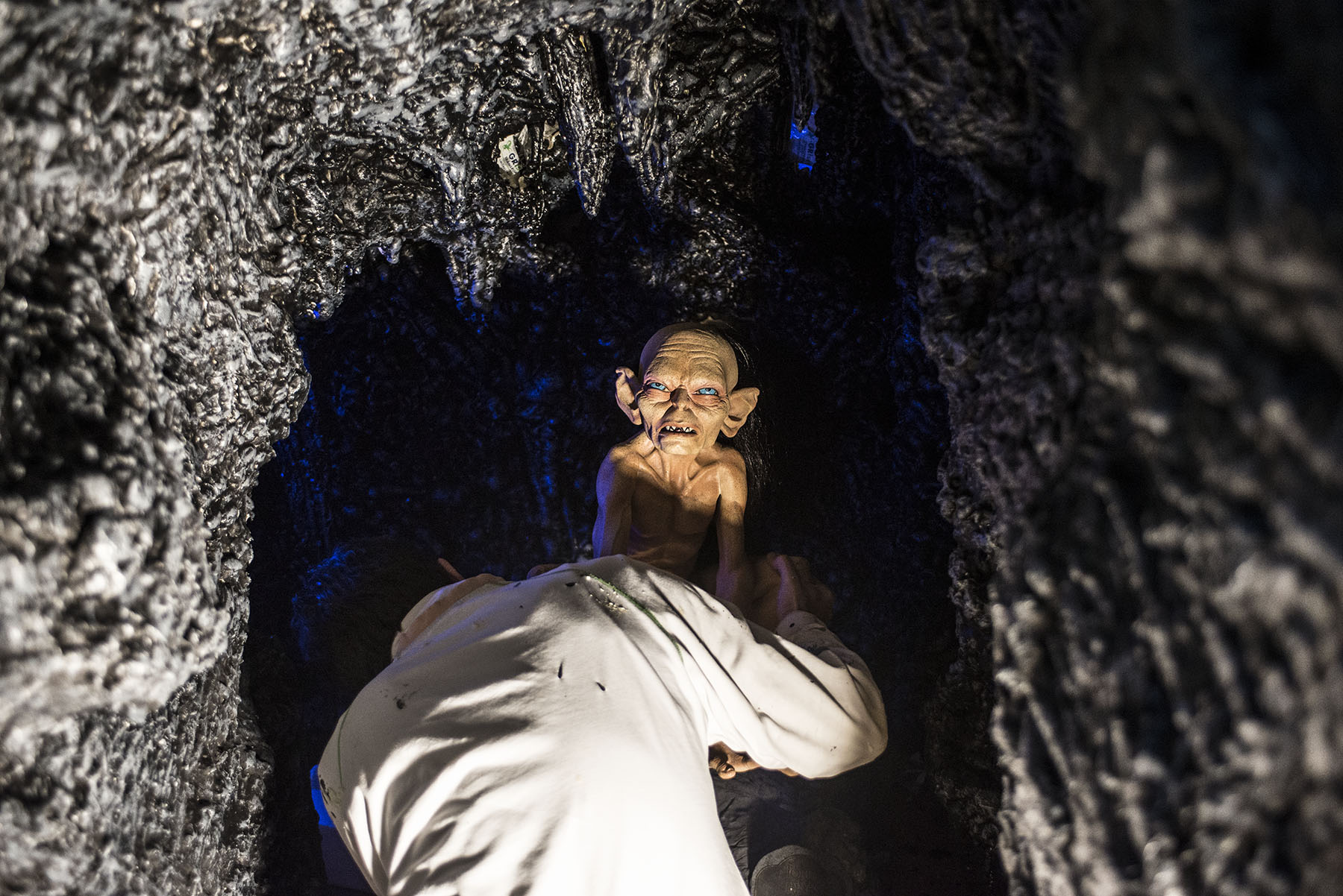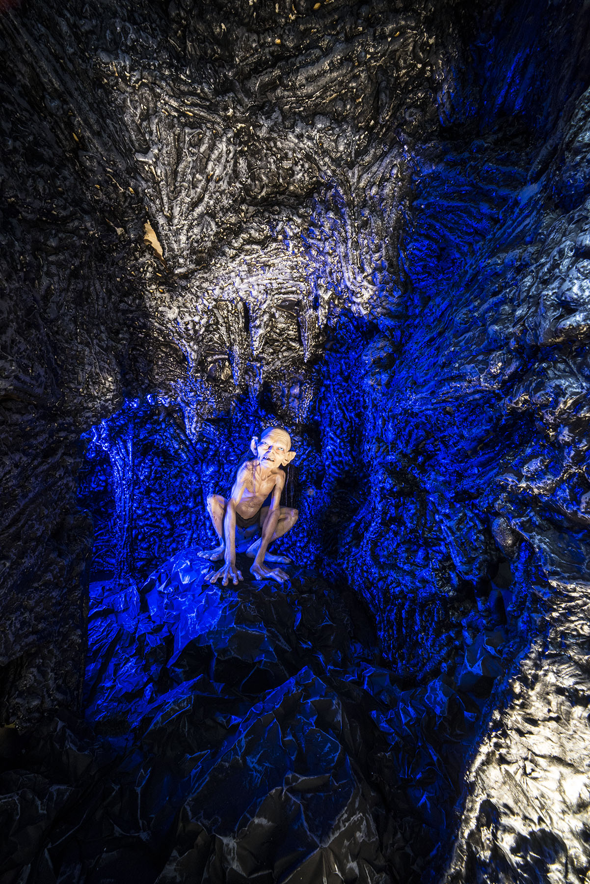 Al centro della caverna, protagonista della sala, si erge su una roccia la statua di Gollum a grandezza naturale. Anche in questo caso si tratta di un’opera particolare. La statua di Gollum, a grandezza naturale, fa parte dell’edizione limitata ufficiale rilasciata dalla casa di produzione cinematografica New Line ai tempi della trilogia del Signore degli Anelli, prodotta in soli 2500 pezzi, creati in maniera individuale uno diverso dagli altri, con tanto di targa numerata e certificato di autenticità. La statua ritrae con dettagli a dir poco impressionanti Gollum accovacciato su una sporgenza di roccia in una posa classica. Guardandola bene, sembra quasi di sentire la sua voce: «Ladri. Ladri. Quegli sporchi piccoli ladri. Dov’è? Dov’è? Ce l’hanno tolto, rubato. Il mio tesoro. Maledetti! Noi li odiamo! È nostro e lo vogliamo!».