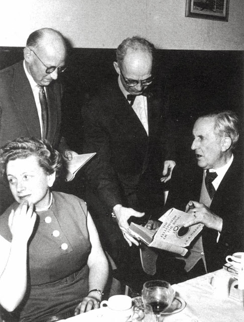 Per fortuna, sulla serata di quel lontano 1958 già si sapeva qualcosa. Alla fine del marzo 1958, Tolkien visitò l’Olanda su invito dei librai di Rotterdam Voorhoeve en Dietrich; le sue spese di viaggio vennero pagate dalla Allen & Unwin. In quell’occasione il professore si trovò a fronteggiare in una sola sala oltre 200 appassionati della Terra di Mezzo e a parlare della sua opera. Una delle portate del menù era la «zuppa Maggot», un’allusione ai funghi del contadino Maggot del Signore degli Anelli. Lo stesso Tolkien ne dà un resoconto nelle lettere (n. 206): «Alle 17.30 di venerdì ho affrontato un gran folla in una sala riunioni. Sembra che oltre duecento persone (in gran parte gente comune) abbiano pagato per essere presenti, ed è stato necessario respingerne molti. Il professor Harting [Piet Harting era professore dell’Università di Amsterdam] era ancora più meravigliato di me. La cena era senza dubbio “abbondante e lunga”: quest’ultima cosa perché i discorsi si susseguivano alle portate. Per l’occasione si è parlato solo in inglese; e tutti i discorsi, tranne uno, sono stati intelligenti (tralasciando i panegirici, che erano piuttosto imbarazzanti). L’unica eccezione è stato uno psicologo lunatico, ma il presidente lo ha abilmente interrotto dopo cinque minuti. Spero che la mia risposta conclusiva sia stata adeguata e pronunciata a voce abbastanza alta; ma non c’è bisogno che mi dilunghi a parlarne. Si è trattato in parte di una parodia del discorso di Bilbo nel capitolo I. Nella patria del fumo, la pipa sembra aver preso piede. C’erano pipe d’argilla sul tavolo e grandi scatole di tabacco – fornito, penso, dalla ditta Van Rossem. I muri erano ornati con manifesti della Van Rossem con le pipe per gli hobbit, in tre qualità: Longbottom Leaf, Old Toby, e Southern Star. V. Rossem da allora mi ha mandato pipa e tabacco! Ho portato via uno dei manifesti […]». Qualche dettaglio in più lo si ricava dalla Biografia di Humphrey Carpenter, dove si narra che Tolkien tenne un vivace discorso in inglese inframmezzato di olandese ed elfico. Il discorso – ripete Carpenter – fu una parodia del discorso d’addio di Bilbo Baggins all’inizio del Signore degli Anelli che si concluse così: