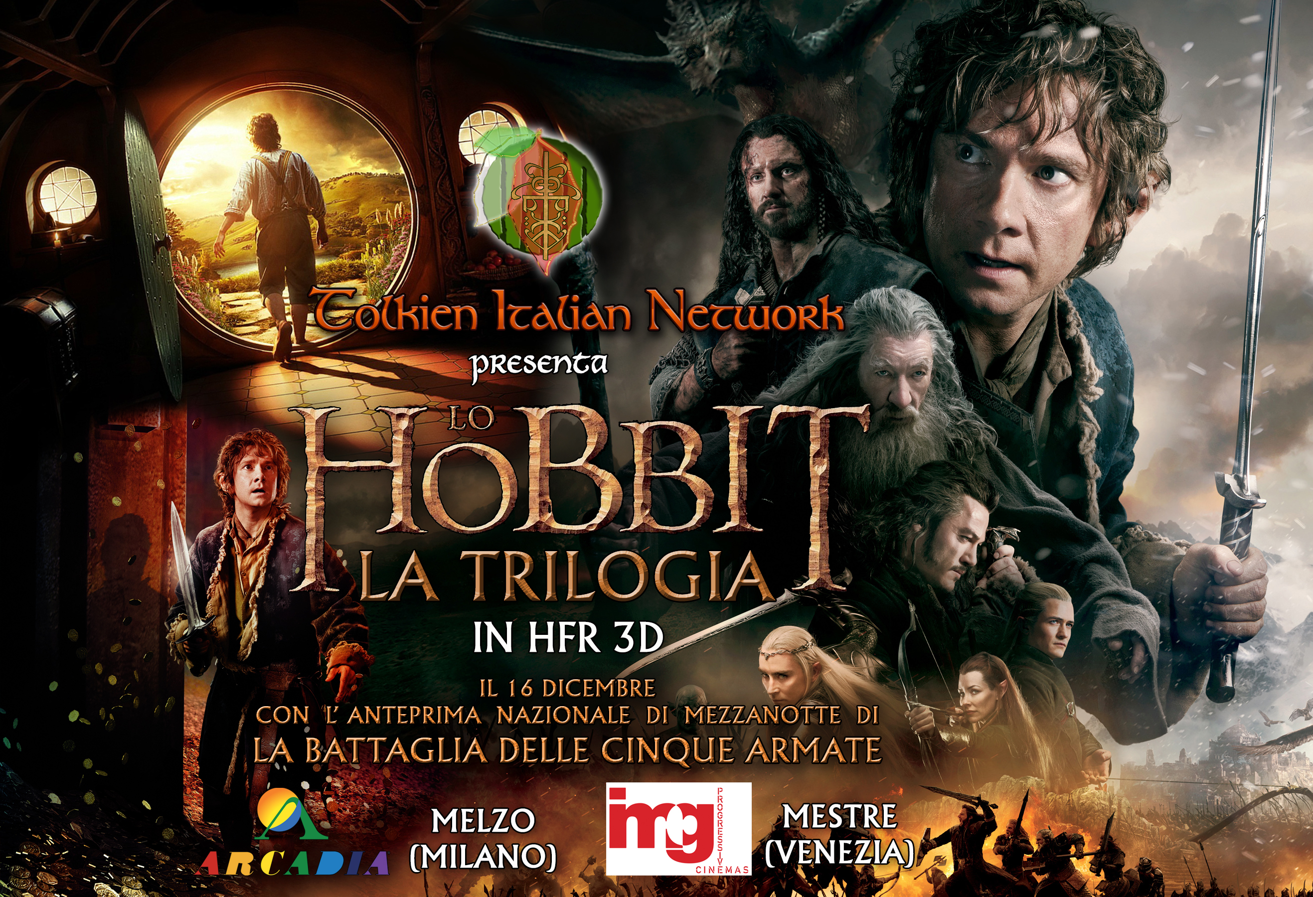Il 16 dicembre si svolgerà presso Arcadia Cinema di Melzo (MI) e IMG Cinemas di Mestre (VE) le prime maratone cinematografiche sullo Hobbit: dal pomeriggio di martedì tornano al cinema Lo Hobbit – Un Viaggio Inaspettato e Lo Hobbit – La Desolazione di Smaug, mentre subito dopo la mezzanotte toccherà all’anteprima nazionale della Battaglia delle Cinque Armate. La scelta è caduta in particolare su queste due sale cinematografiche perché, spiega il TIN «ARCADIA e IMG, eccellenze italiane del cinema digitale dai suoi albori, in Europa e nel Mondo. L’uso di Jackson della tecnologia HFR 3D ha già mostrato le sue potenzialità e i suoi pregi nei due capitoli precedenti dello Hobbit, ma con una guerra in atto nell’ultimo ogni scena verrà esaltata. Non guardare La Battaglia delle Cinque Armate a 48 fps avrebbe significato perdersene metà». Invece, la sala Energia di ARCADIA possiede lo schermo più grande d’Europa e il sistema audio certificato THX, mentre la sala 3 di IMG possiede il primo impianto fisso di proiezione laser e Dolby Atmos». Le prevendite sono già iniziate, maggiori informazioni si possono trovare qui