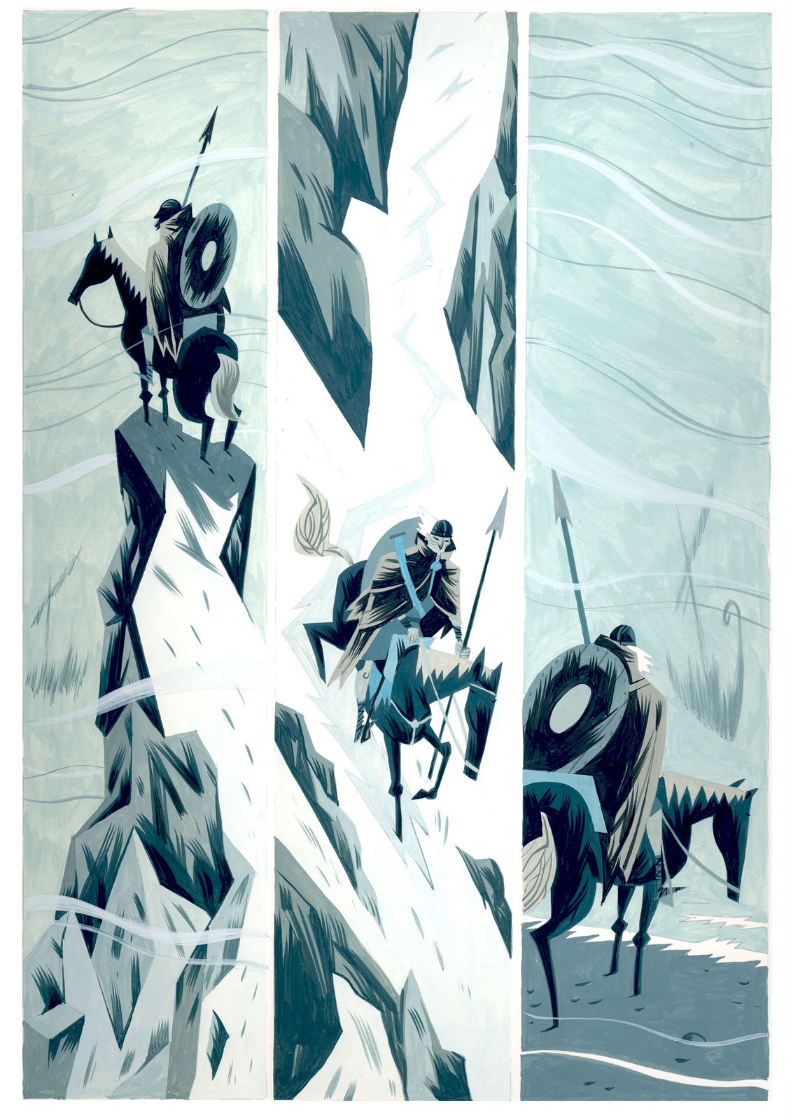 Come spiega Olivares, sempre nella postfazione, «i due autori propongono una struttura analitica che scompone con cura il mito per tornare ad assemblarlo davanti ai nostri occhi. Le vignette sembrano più che altro barriere incapaci di contenere la sfrenata brutalità che si consuma al loro interno e il rosso sangue è la base cromatica sulla quale David ha dipinto tutta questa storia ancestrale, rosso che sembra sempre sul punto di trapassare la pagina». Dunque, già dalle prime tavole, si capisce che García ha deciso di lasciare intatta la storia così come ci è stata tramandata (con alcune minime variazioni nel finale), rispettando l’opera originale e cercando di modernizzare il testo. Così i brevi dialoghi cedono molto spazio alle scene di lotta, che grazie al disegno di Rubín, vengono descritte nei minimi dettagli anatomici. Il disegnatore ha voluto fondere il suo tratto sporco con una sensibilità cinematografica nelle inquadrature per rendere il dinamismo e l’energia delle scene d’azione.