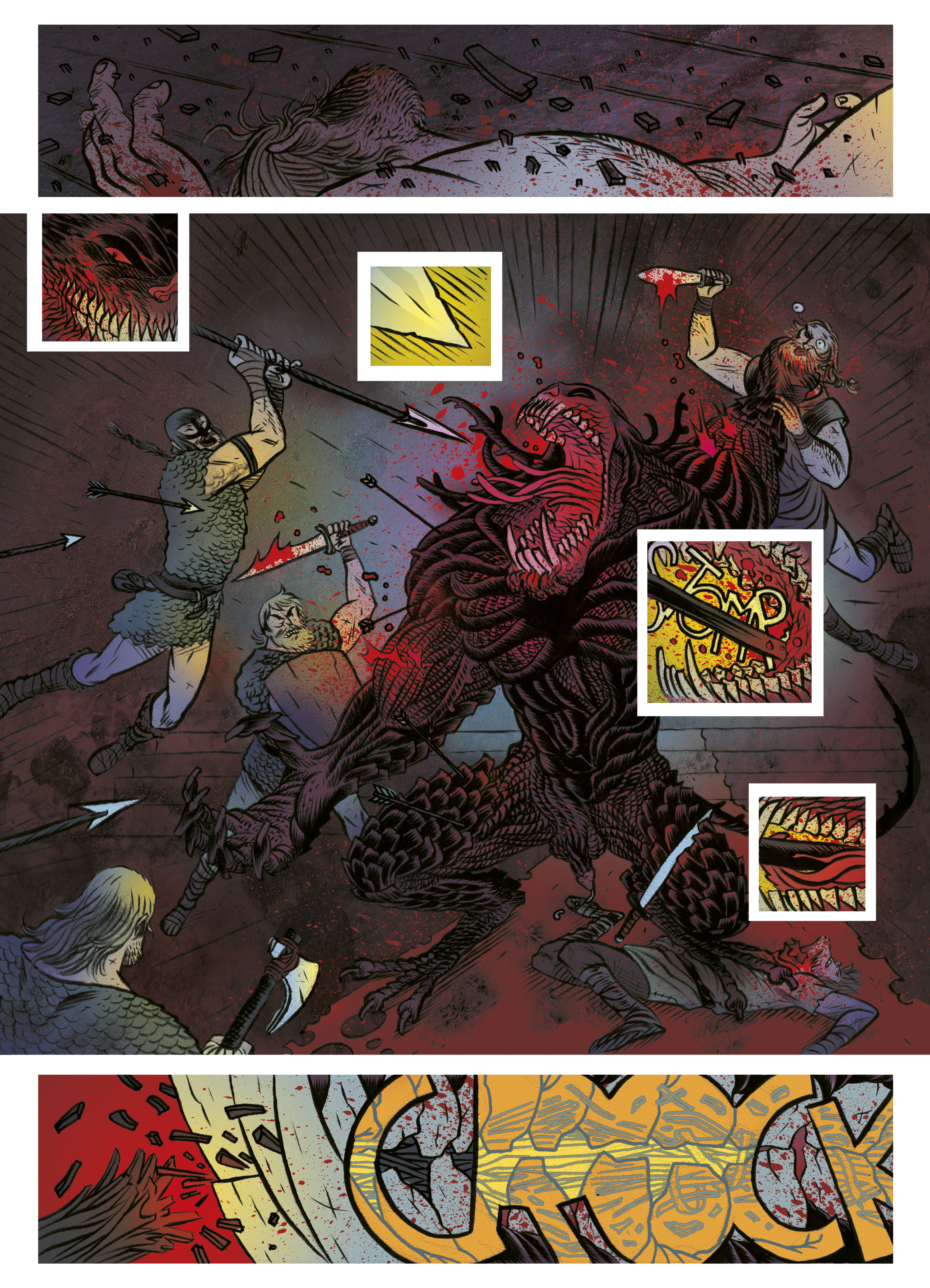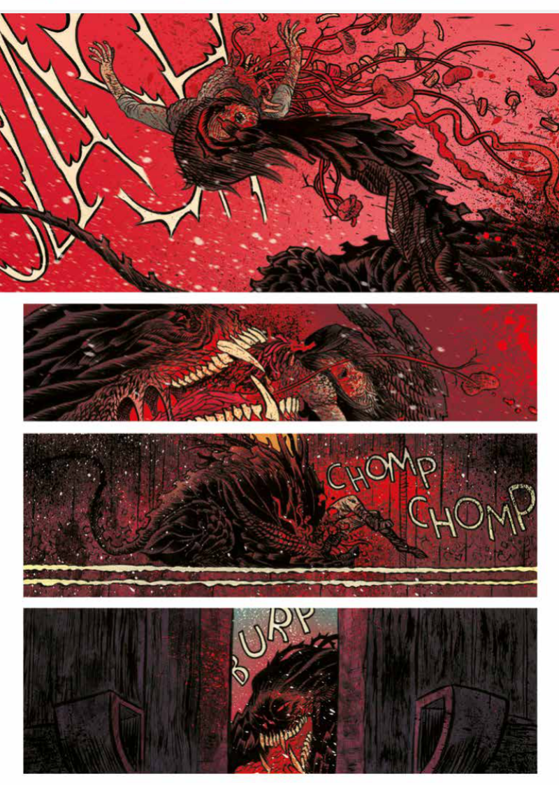 Non si può però non concludere con una riflessione che dà il senso di tutto l’articolo. Beowulf va preso per quello che è: l’eterna dicotomia tra il bene e il male. Per effetto della continua narrazione parallela di eventi scandita dalla frammentazione della tavola, ciò che salta all’occhio del lettore è il forte dualismo tra gloria e miseria, tra passato e presente. Il male, la miseria e la morte sono emblematici anche negli antagonisti – Grendel e sua madre sono discendenti di Caino. Lo stesso drago della parte finale è avido di danaro, ispirando lo stesso Tolkien nella creazione di Smaug nello Hobbit. La fisicità con cui è rappresentata la storia è comune sia agli eroi che ai mostri, tutti sono bramosi di sangue, carne, gloria o ricchezze. Questo accostamento è sottolineato dalle identiche inquadrature che gli autori scelgono per rappresentare prima Grendel, poi lo stesso Beowulf: il punto di vista del lettore è dall’interno della bocca, organo strettamente collegato con la consumazione.