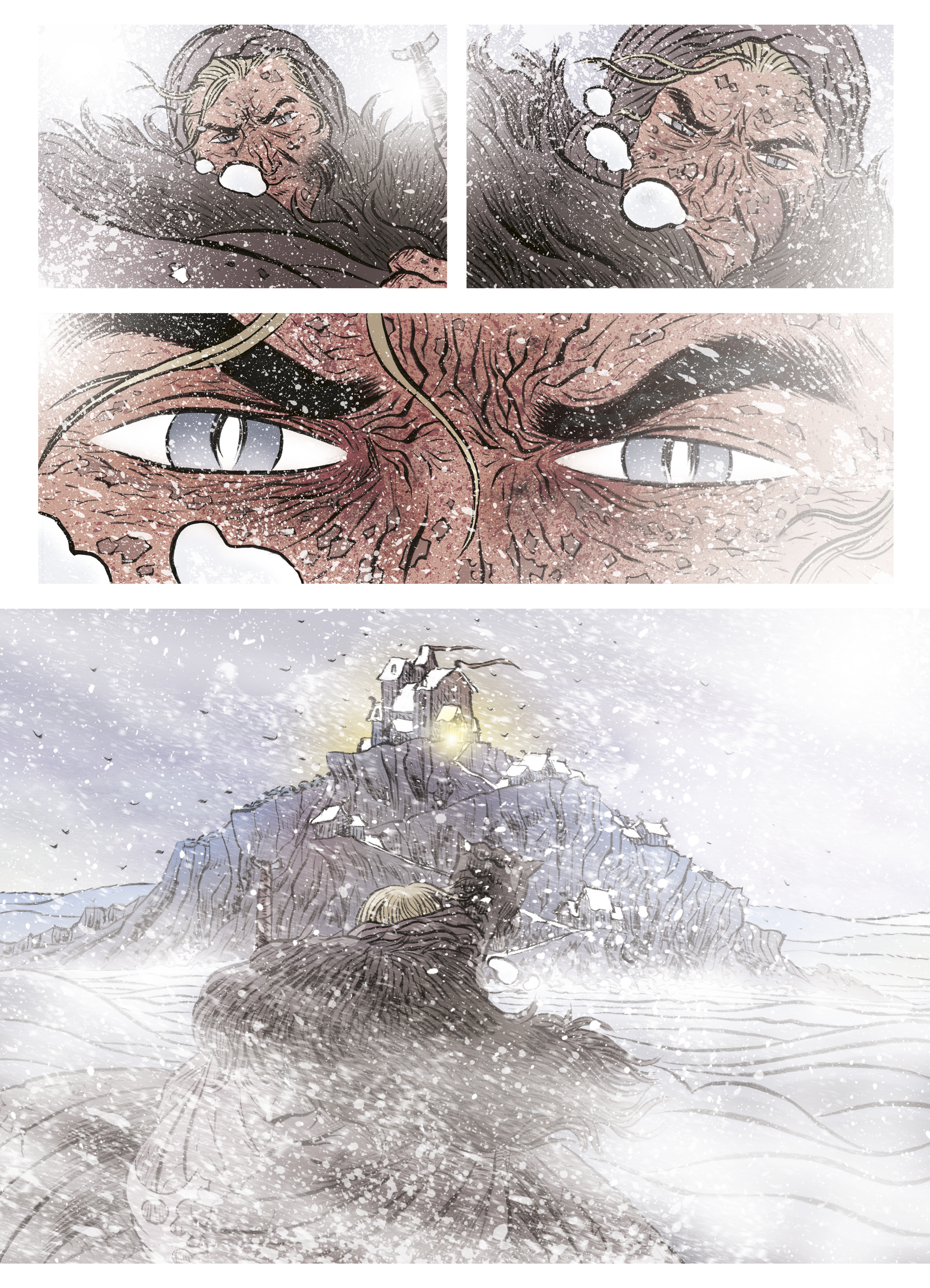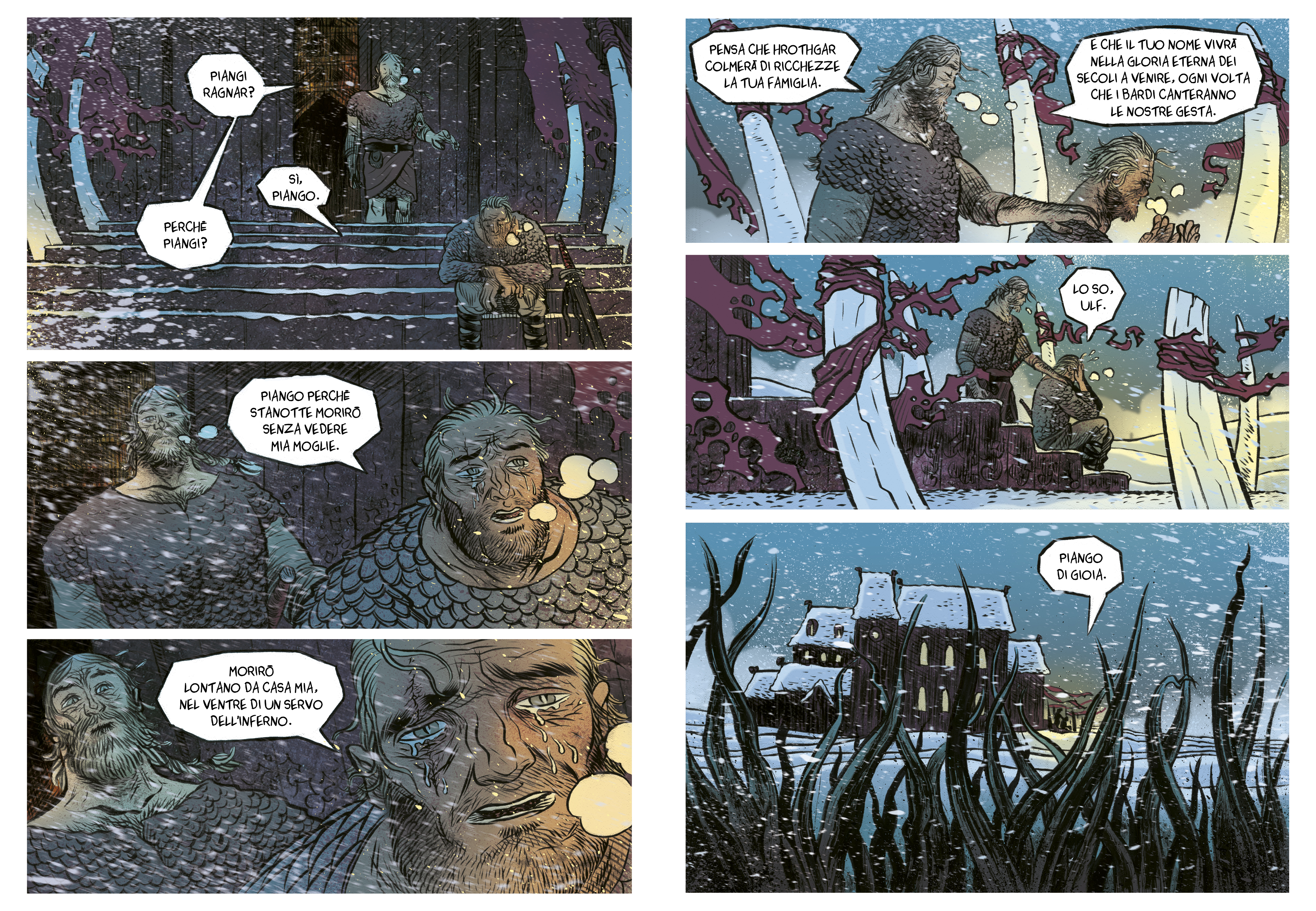 La tecnica dei piccoli riquadri per spostare l’attenzione del lettore su questo o quel dettaglio risulta assolutamente efficace e l’alternanza tra vignette orizzontali e lunghi pannelli verticali dà più ritmo alla lettura, aiutando il lettore a riflettere con Beowulf. Rubín, infine, dissemina la storia di doppie «splash page» che lasciano a bocca aperta e danno agli enormi mostri lo spazio che meritano. Si può osservare lo spettacolare lavoro fatto da Rubín in una splash page, la pagina 3 del volume, direttamente sul suo blog. La graphic novel scorre veloce, così come il sangue e le vignette. Il sangue, come detto, diviene un vero e proprio elemento narrativo oltre che cromatico. Il disegnatore spagnolo riesce a cogliere gli aspetti profondi della storia di Beowulf, rappresentando un personaggio in tutta la sua forza e drammaticità, concentrandosi anche sul suo aspetto umano: