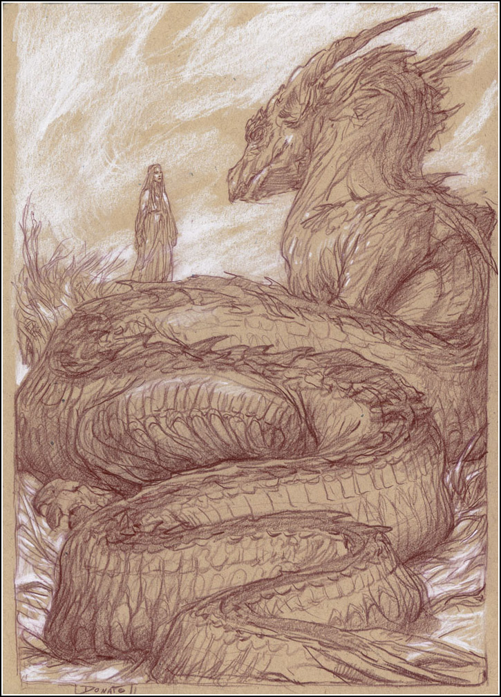 «Come accennato prima, il disegno di Giancola raffigurante Niniel appena dopo la morte di Glaurung, mi ha dato l’idea del rappresentare il termine di una battaglia. Altre influenze provengono dallo studio preparatorio di Giancola raffigurante Eowyn contro il Nazgul ed una illustrazione di Maciej Kuciara raffigurante un guerriero che fronteggia un drago. Ci tenevo al raffigurare un campo di battaglia devastato dallo scontro in cui i sopravvissuti iniziano a comprendere le perdite subite. Credo che la guerra tra Nani ed orchi per il possesso di Khazad-Dum sia direttamente ispirata alla guerra di trincea vissuta da Tolkien sulla Somme, dovevo averne rispetto citandone la tragicità».