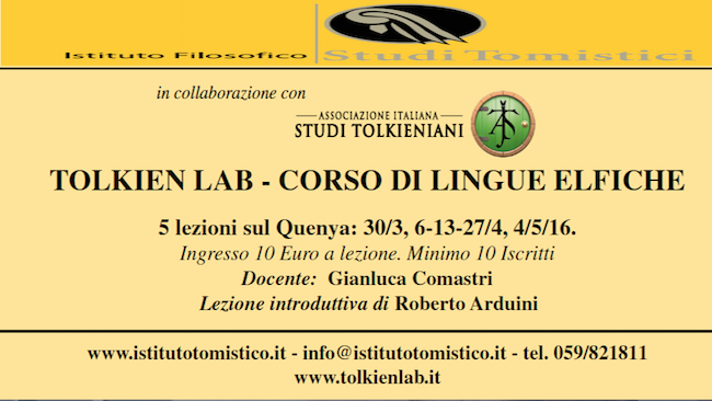 Il Tolkien Lab di Modena, lo spazio tolkieniano modenese gestito dall’Associazione italiana studi Tolkieniani e dall’Istituto Filosofico di Studi Tomistici, ha deciso di ospitare a partire dal prossimo 30 Marzo un corso di Lingue Elfiche, ideato all’interno di una collaborazione tra Eldalië e lo smial degli