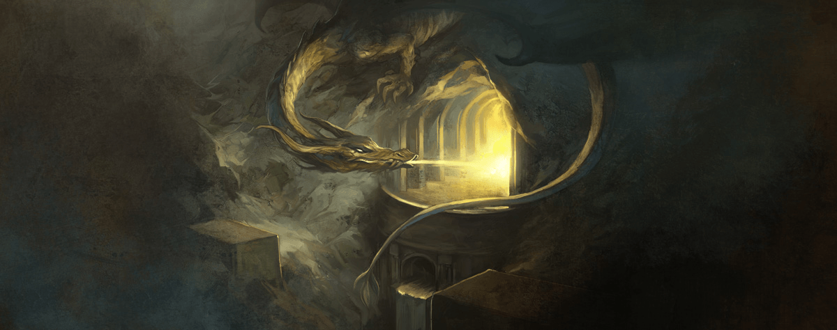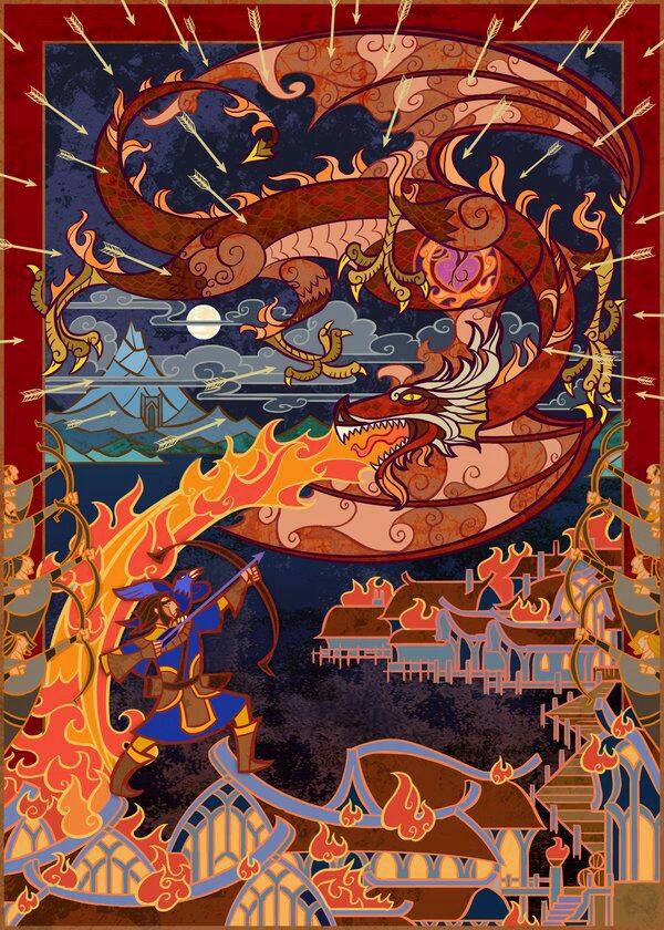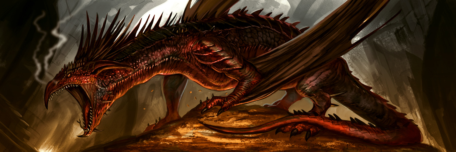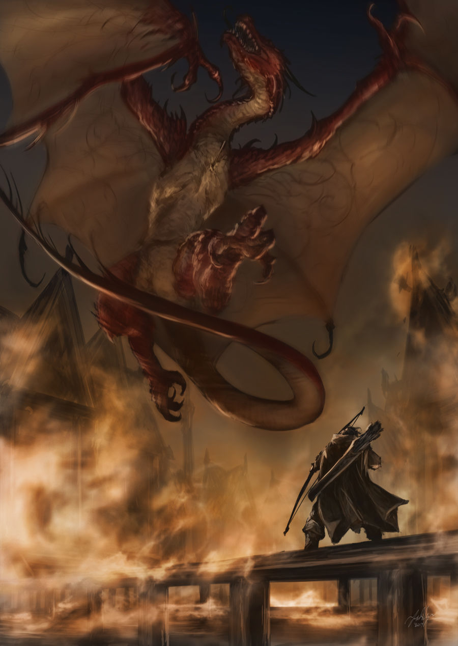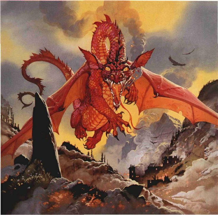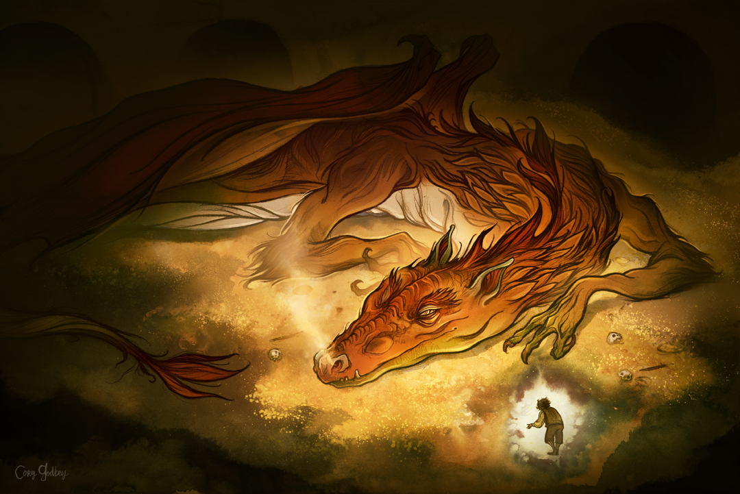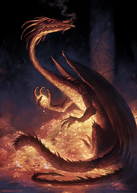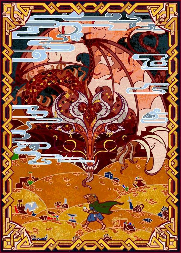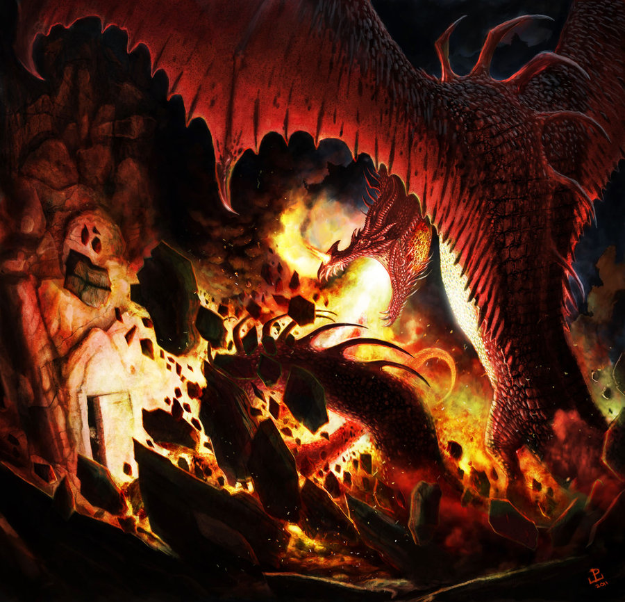 Avevo udito questo nome più e più volte. La sua pelle squamosa brillava, incrostata dell’oro e dei gioielli del tesoro sul quale aveva dormito per due secoli. Il suo respiro di fuoco poteva sciogliere il più duro dei metalli in un battito di ciglia.