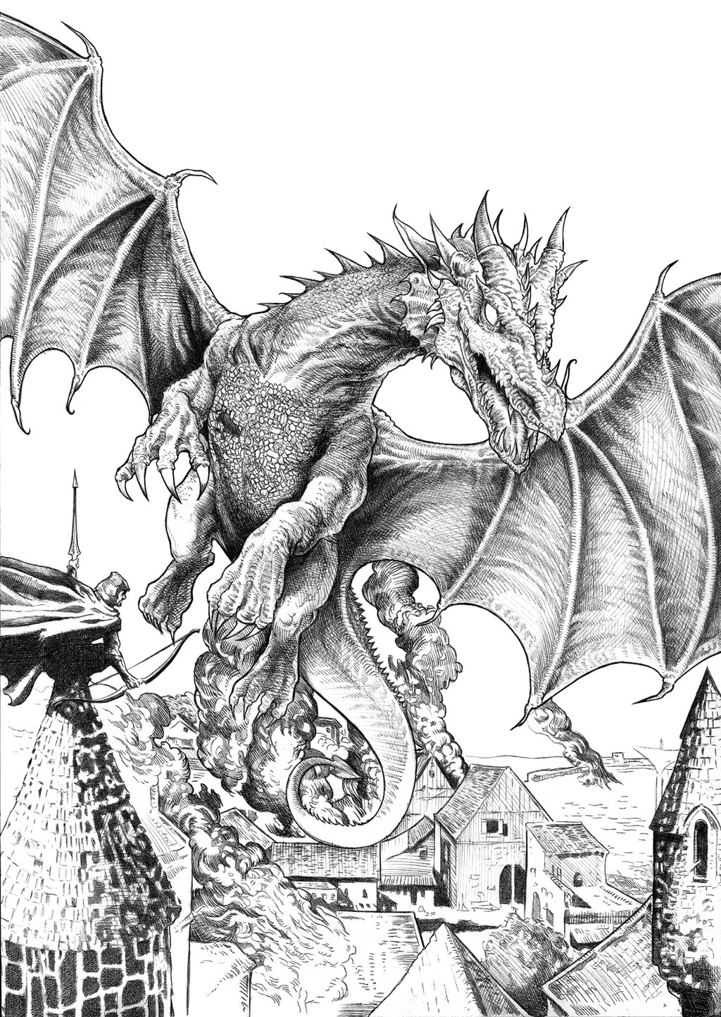 Nei giorni successivi, l’immagine iniziò a prendere forma. La possente figura di Smaug venne alla luce: un drago come nessun altro, nell’atto di sollevarsi sulle zampe posteriori nella sua tana cavernosa, sopra un letto di monete d’oro, spade, gemme e diamanti.