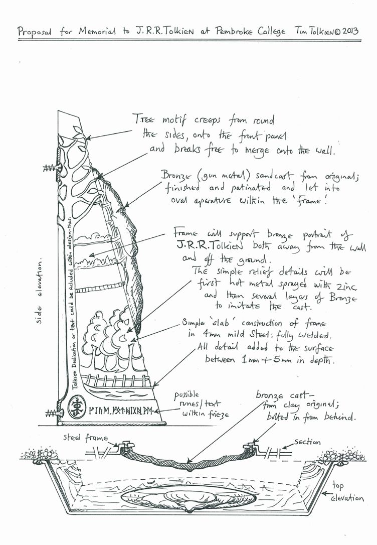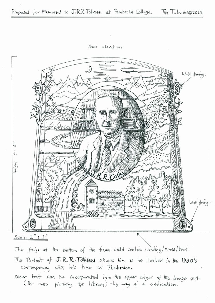 Uno schizzo della targa è stato proposto dal bisnipote del professore, Tim Tolkien, il quale è uno scultore specializzato nella realizzazione di opere in metallo (la targa dovrebbe essere appunto in bronzo) e che in passato ha già lavorato per l’arte pubblica. Nella bozza di Tim, J. R. R. Tolkien è ritratto circondato da un paesaggio bucolico, tra colline, boschi e monti che ricordano la Terra di