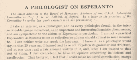 Di seguito, Smith e Wynne riportano un lettera scritta da Tolkien al Comitato per l’educazione della British Esperanto Association di cui era stato nominato consigliere onorario, nella quale, a mo’ di excusatio non petita, lui stesso dichiara di avere soltanto una conoscenza basilare dell’esperanto: