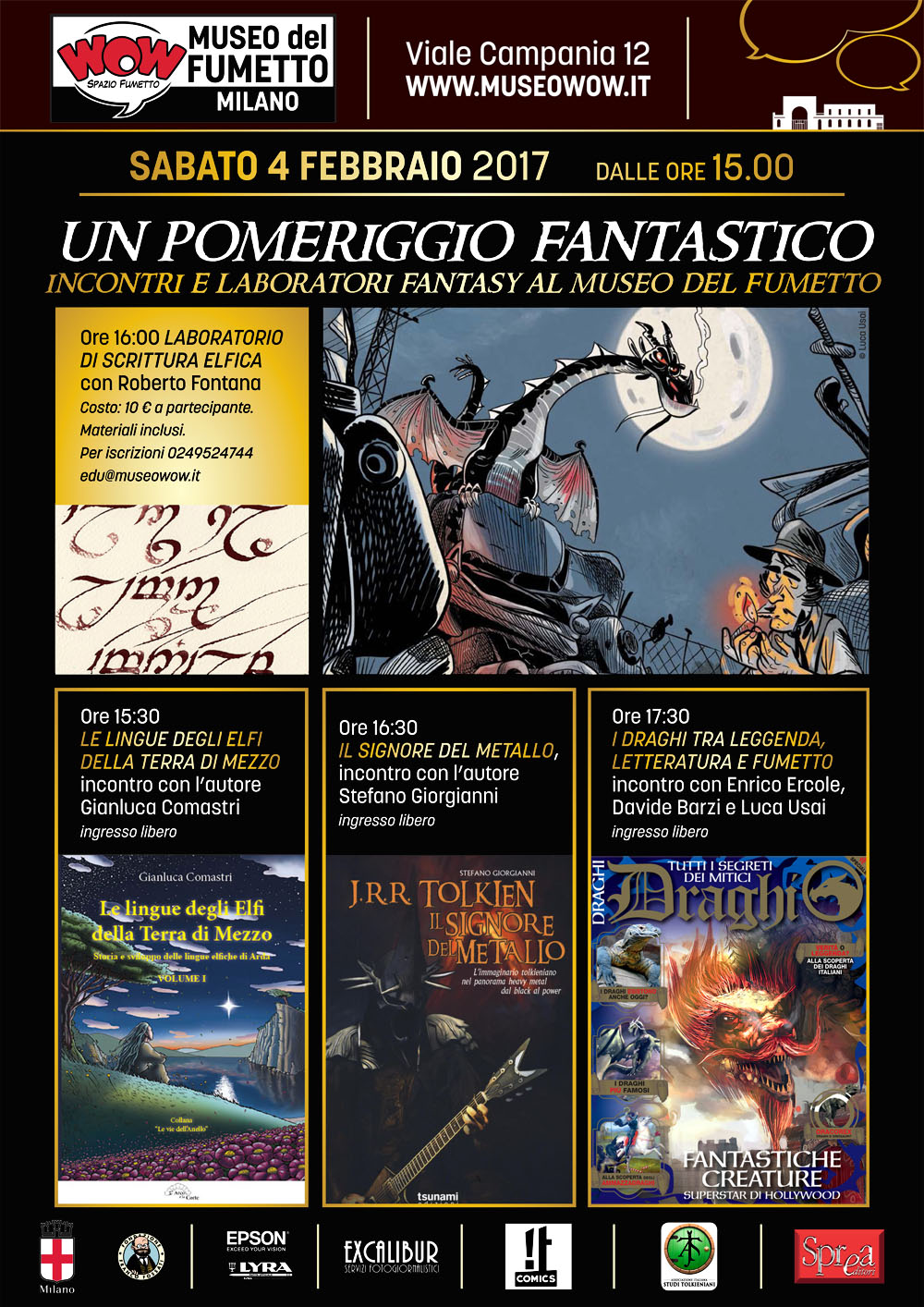 In occasione della mostra “Lords for the Ring”, allestita fino al 12 febbraio in collaborazione con Lucca Comics & Games e Associazione Italiana Studi Tolkieniani, sabato 4 gennaio WOW Spazio Fumetto dedica un intero pomeriggio a tutti gli amanti del fantasy con presentazioni di libri e fumetti e uno speciale laboratorio di scrittura elfica. Si parlerà di draghi, di Tolkien, di musica, di creature fantastiche e si imparerà a scrivere in elfico. Ecco il programma: