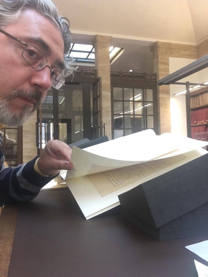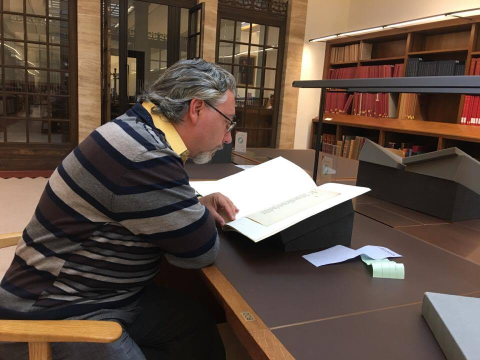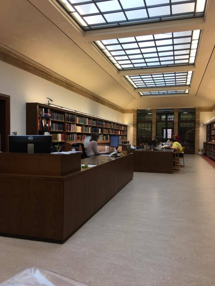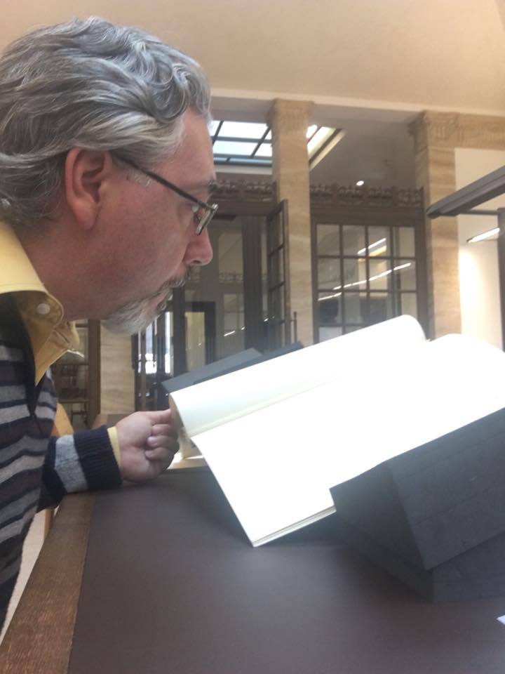 I manoscritti e molti libri della biblioteca personale di Tolkien ci vengono portati dopo un po’ e finalmente ci mettiamo al lavoro. Claudio ha consultato il manoscritto Ms 14 folio 151, tutti erano già stati visti nel 2013, ma stavolta con occhi diversi: contiene la nota e del saggio Sulle Fiabe scritta in autografo. Claudio ha consultato anche alcune pubblicazioni originali del 1936 relative alla celebre mostra surrealista che si tenne a Londra in quell’anno per cercare di capire da quali fonti Tolkien aveva attinto per conoscere il movimento artistico francese. Tra i libri consultati ci sono anche diversi numeri della rivista della Facoltà in cui Tolkien insegnava, con diversi suoi contributi (uno sullo stato dell’arte della filologia nel 1924) ed è curioso scoprire come gli argomenti spaziassero molto, dall’economia alla politica, dalla storia irlandese fino ad arrivare alla scrittura cinese. Proprio sfogliando quest’ultimo mi fa pensare come l’arte della calligrafia cinese abbia affinità con le lingue elfiche…