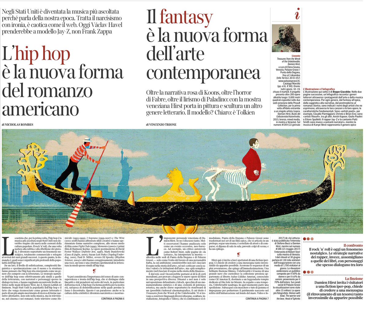 I lettori più attenti avranno già capito qual è il punto di contatto tra l’artista e lo scrittore de Il Signore degli Anelli. E a dirlo non siamo noi, ma un noto critico d’arte sull’ultimo numero de «La Lettura», l’inserto culturale del Corriere della Sera, Vincenzo Trione. Nel lungo articolo dal titolo Il fantasy è la nuova forma dell’arte contemporanea il critico spiega bene come in fondo, la mostra veneziana è anche il primo tentativo per importare nei confini dell’arte contemporanea l’immaginario del fantasy. L’ex enfant terrible della Young British Art, per Treasures from the Wreck of the Unbelievable, parte proprio da Tolkien. Ovvero, il precursore del fantasy, tra i generi letterari e cinematografici oggi di maggiore successo. Nelle sue interviste, quasi per riscattarsi da quanti lo giudicano un «barbaro» e per legittimarsi sul piano intellettuale, egli spesso ricorda artisti e pensatori del passato e parla di tematiche filosofiche e metafisiche. Nell’articolo si legge che Tolkien è il «maggior studioso di letteratura anglosassone e medioevale (che) aveva scritto a sua volta un’epopea secondo le regole del genere cavalleresco, diventando il servitore appassionato delle stesse forze che aveva sentito pulsare nei versi di uomini morti da più d’un millennio». Fiaba che parla di «cose permanenti: non di lampadine elettriche, ma di fulmini», Il Signore degli Anelli ci consegna archetipi letterari divenuti figure e creature situate «tra il mondo sublunare e il terzo cielo».