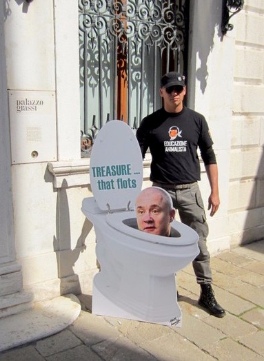 Hirst è famoso per esporre animali uccisi e inglobati nella formaldeide, o imbalsamati, e per l’impiego di migliaia di Farfalle le cui ali vengono strappate e incollate su oggetti vari. La morte e il gusto del macabro servono ad attirare l’attenzione. Poi ricchi collezionisti come Saatchi e addirittura la prestigiosa Sotheby’s pensano a far salire artificialmente le quotazioni del ciarpame di Hirst. È una squallida operazione commerciale basate sulla morte e il disprezzo verso esseri viventi e senzienti». Questo il comunicato di 100% Animalisti che per protestare contro la mostra a Venezia in un blitz notturno hanno portato quaranta chili di sterco davanti all’ingresso di Palazzo Grassi a Venezia.