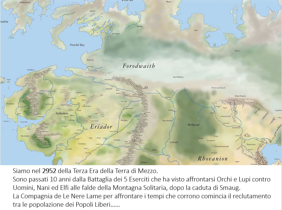 Nel gioco, Le Nere Lame sono una compagnia di avventurieri con la missione specifica di opporsi al male. Lo fanno in modi diversi: la feroce caccia alle creature malvage (in particolare i Draghi), la compassione verso la sofferenza, la cura dello spirito e l’elevazione culturale. Questi elementi sono racchiusi nello stemma della Compagnia dove la spada nera, che trafigge il drago così come fece Turin con Glaurung, rappresenta la dimensione agonistica e combattiva, la lacrima, memoria di Nienor, rappresenta la compassione e la cura dell’altro e le sette stelle sono segno delle pietre veggenti che gli Eldar hanno donato ai Numenoreani e rappresentano la Sapienza e l’amore per la bellezza. Vivono nella Terra di Mezzo nel periodo precedente la Guerra dell’Anello. Ho cercato di infondere, il più possibile e per quanto mi è possibile, nel progetto uno spirito autenticamente Tolkieniano, rimanendo fedele al “canone” e in questo intento le frequentazione del gruppo Studi Tolkieniani è stato fondamentale donandomi costanti stimoli creativi e pareri di esperti quando avevo bisogno di consultazioni.