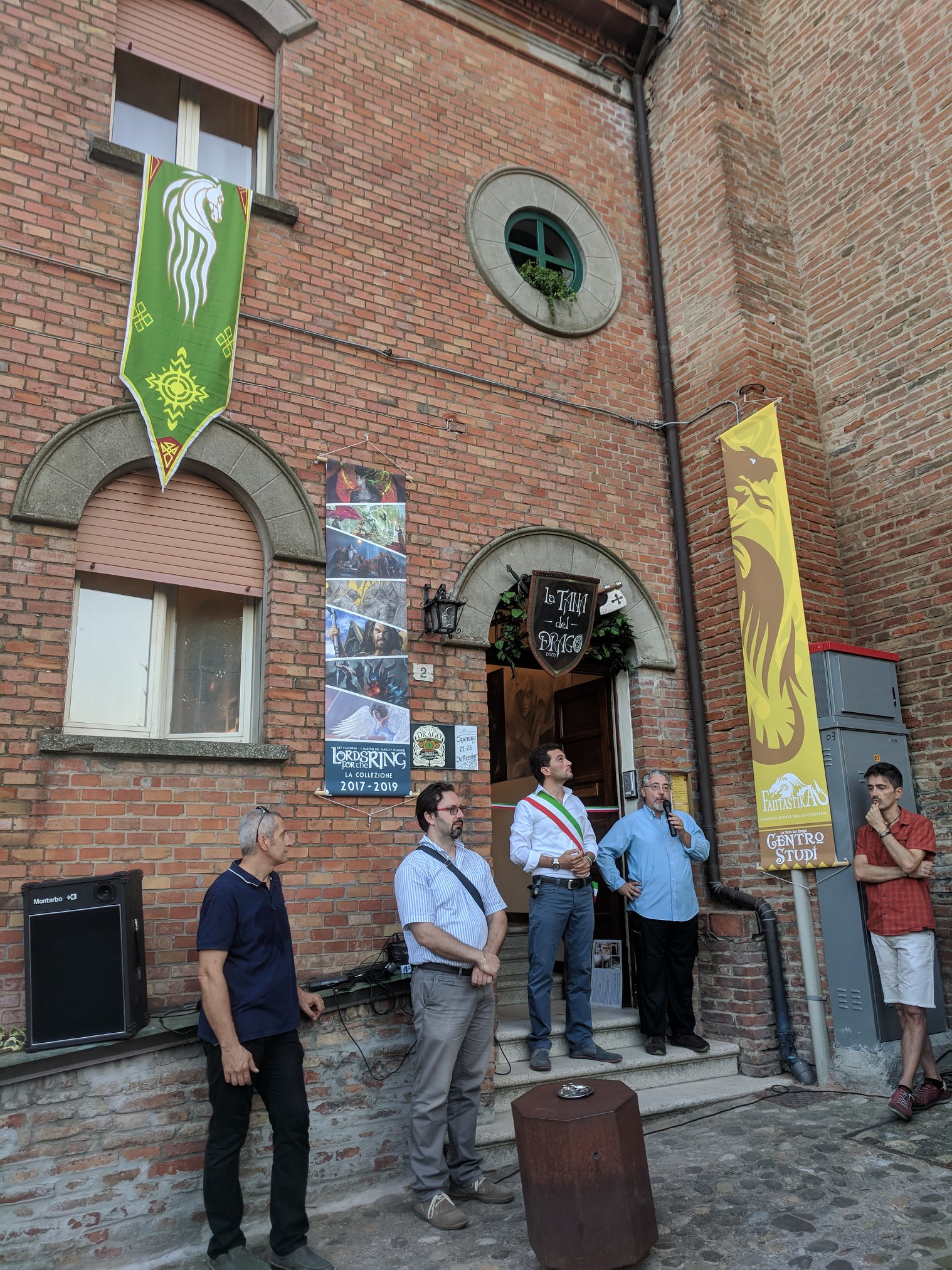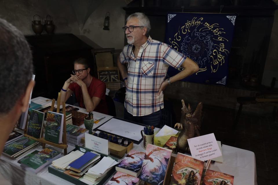 Il Centro Studi – la Tana del Drago, inaugurato venerdì 21 settembre con la presenza del sindaco di Dozza Luca Albertazzi e la presidentessa dell’Fondazione Dozza Città d’Arte Simonetta Mingazzini è stato una delle più grandi novità di questa edizione, nonché sede di molte delle conferenze che sono state proposte, con tanto di ospiti internazionali: il docente Edouard Kloczko, linguista, traduttore e saggista specializzato in lingue elfiche ha tenuto sia sabato che domenica corsi sulle lingue costruite da Tolkien e parlate dal suo popolo immortale, mentre la nostra socia Sara Gianotto si è occupata della scrittura elfica, insegnando l’utilizzo delle tengwar.