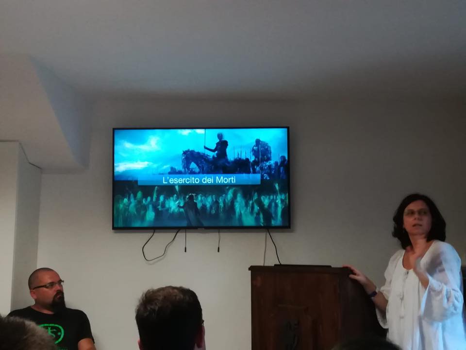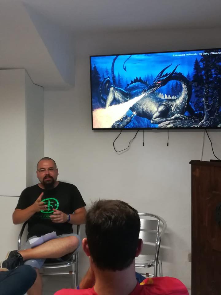 Il programma delle conferenze presentate quest’anno ha spaziato su ogni ambito del fantastico: Tolkien e la letteratura fantastica (Le figure femminili nelle opere di Tolkien con Maila Lodoli, La magia nel Signore degli Anelli con Valentina Fatichenti, Draghi e magia nel Signore degli Anelli e nel Trono di Spade con Barbara Sanguineti e Stefano Mangusta, Tra arte e folclore: gli Uomini selvaggi di Tolkien con Ferruccio Cortesi e Carla Iacono Isidoro, Visioni, miti e leggende: l’arte di J. R. R. Tolkien con Roberta Tosi, Aspettando la nuova traduzione de Il Signore degli Anelli con Loredana Lipperini e Giampaolo Canzonieri, Il sole tra nubi oscure. Dalle fiabe alle visioni fantascientifiche, i racconti possono salvarci? con Francesco Filippi, Criptozoologia. Anatomia di un drago con il dott. Cristiano Bombardi, La fantascienza russa: l’Uomo Anfibio e Solaris con Wu Ming 4 e Stefano Giorgianni, F come falso: Ursula K. Le Guin con Loredana Lipperini), l’illustrazione che immortala le idee su tela e carta (2008-2018: dieci anni di libri illustrati, con Paolo Barbieri e Emanuele Vietina, Storie di corvi, spade incantate e mondi perduti di Michele Rubini, La fantascienza russa nell’illustrazione italiana con Luca Solo Macello e Stefano Giorgianni), il mondo del fumetto (Supereroi: una mitologia moderna a cura di Red Capes, Il Fantastico da Dylan Dog al thriller in prosa con Paola Barbato, Lorenzo Gammarelli e Alessio Vissani, La generazione di Goldrake compie 40 anni: storia, valori e linguaggi con Paolo Barbieri, Andrea Gualandri e Francesco Filippi), quello ludico (Quei fantastici giochi di ruolo, i gdr dedicati alla Terra di Mezzo con Francesco Nepitello e Roberto Arduini, Orchi ed Elfi a suon di bit. Il Fantasy tra computer e videogiochi con Alessia Padula), ma anche il piccolo e grande schermo (Fatti un film! con Francesco Filippi, finanche alla moda (con Fantasy fashion di Angelo Montanini). Se prima abbiamo accennato alle gioie della tavola, durante questi due giorni ancora di più si è nutrita la mente, soddisfatta la curiosità e stimolato l’appetito per la conoscenza. D’altronde, gli amanti dell’opera tolkieniana hanno imparato dal Professore che la Fantasia è una naturale attività umana, la quale certamente non distrugge e neppure reca offesa alla Ragione; né smussa l’appetito per la verità scientifica, di cui non ottude la percezione. Al contrario: più acuta e chiara è la ragione, e migliori fantasie produrrà.