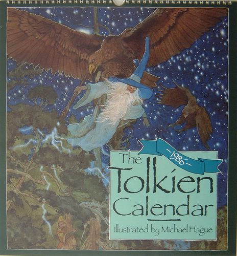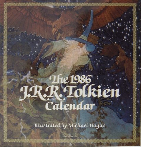 Nel calendario 1986 furono utilizzate le illustrazioni di Michael Hague dell’edizione 1984 per Houghton Mifflin de Lo Hobbit illustrato, dallo stile fiabesco, con i suoi caratteristici personaggi drappeggiati in broccati medicei (v. immagine Thorin, Prisoner of the Elves). Delle 48 illustrazioni a colori che componevano Lo Hobbit illustrato, sette sono state ristampate in Tolkien’s World: Paintings of Middle-earth. L’artista si è sempre detto ispirato e influenzato da Arthur Rackham, Hiroshige, Walt Disney e dai libri delle fiabe curati da Andrew Lang con le illustrazioni di Henry Justice Ford. «Mia madre è nata e cresciuta a Londra. Dopo la seconda guerra mondiale è emigrata negli Stati Uniti», ha raccontato in una intervista,
