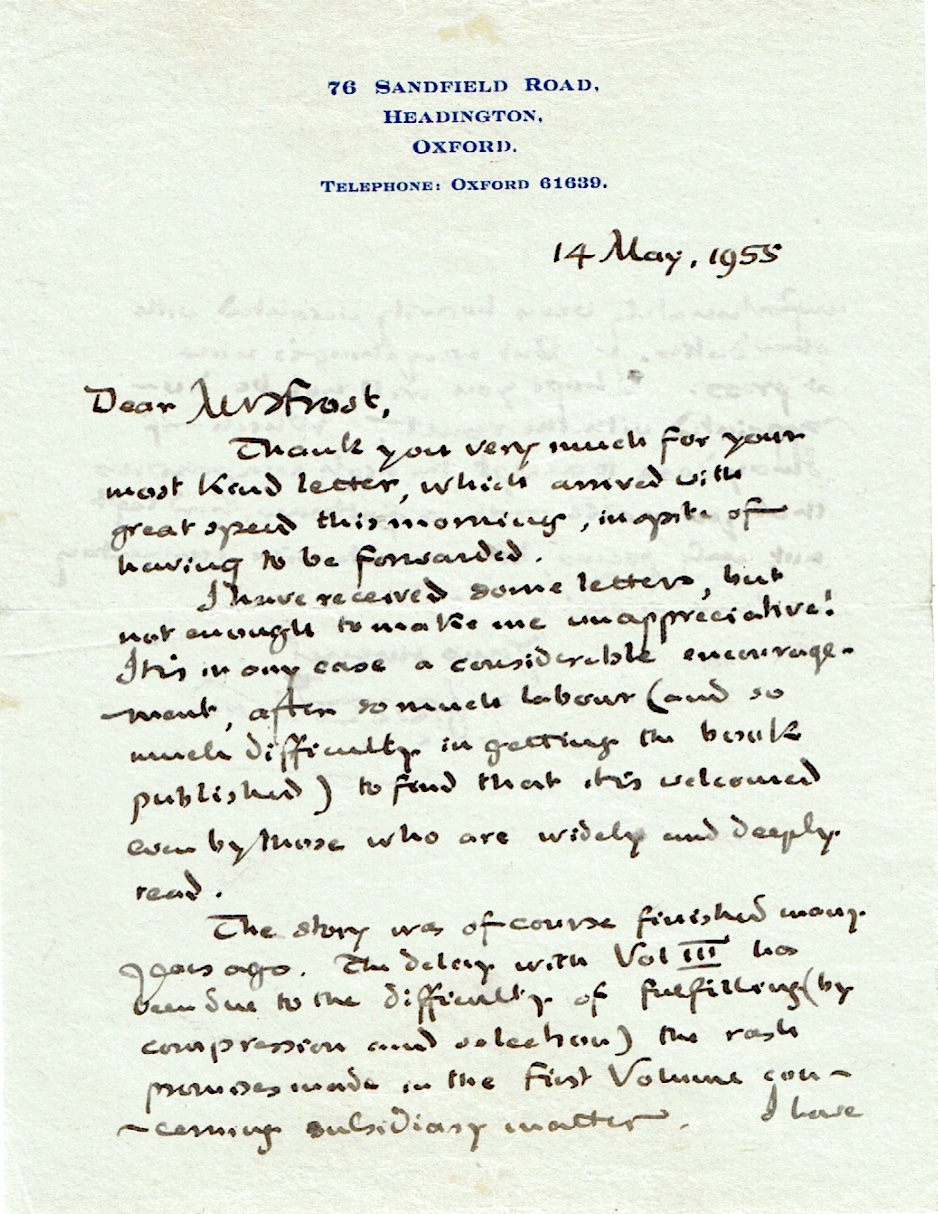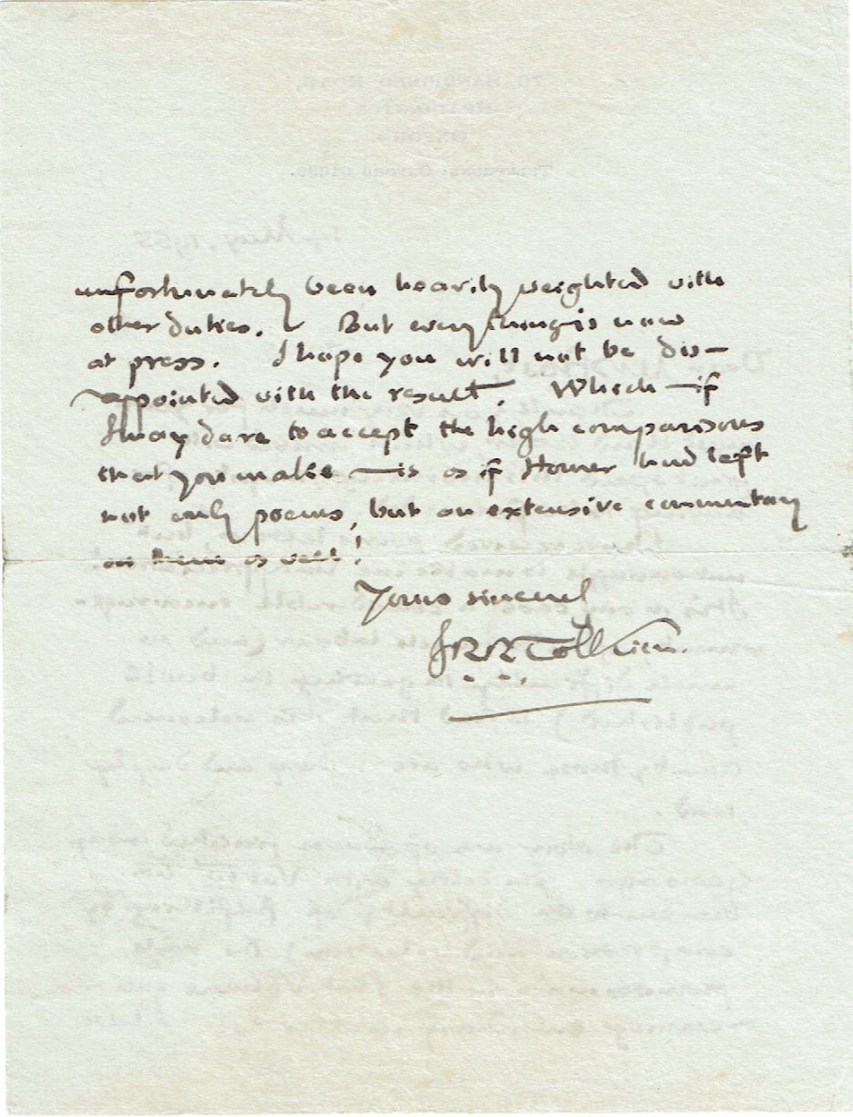 But everything is now at press. I hope you will not be disappointed with the result. Which—if I may dare to accept the high comparisons that you make—is as if Homer had left not only poems, but an extensive commentary on them as well!”. Therefore, as we know from Tolkien’s letters to his publisher, the delay was due to his revisions of the ending and the preparation of Appendices, maps, and indexes (the “supplementary matters” mentioned here), parts of which ultimately had to be omitted due to space constraints. But who was the author writing to?