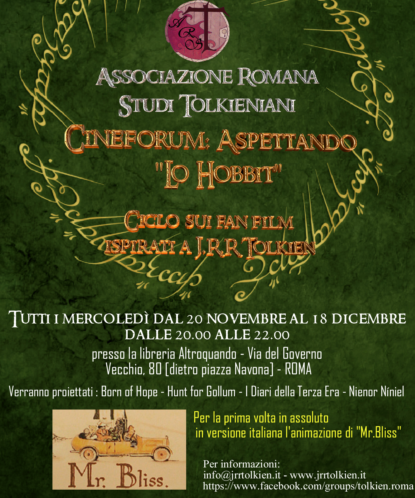 In attesa della Desolazione di Smaug, secondo capitolo della trilogia che il regista Peter Jackson sta dedicando al libro di J.R.R. Tolkien “Lo Hobbit”, l’Associazione romana studi Tolkieniani (www.jrrtolkien.it) lancia un ciclo tutto dedicato ai “fan film” del “Signore degli Anelli”. Sono ormai un genere a sé, film prodotti dagli appassionati a proprio uso e consumo, senza scopo di lucro e con budget ridottissimi. Ma da qualche anno la loro qualità è divenuta professionale, grazie all’impegno di registi, maestranze e attori professionisti, con sceneggiature ben strutturate. I “fan film” fanno appello a una base di appassionati solida e definita, ora anche disposta a intervenire concretamente nella realizzazione con il finanziamento diretto online (crowdfunding). A partire dal 20 novembre, verranno proiettati i migliori fan film realizzati nella Terra di Mezzo. Ogni mercoledì sera, dalla 20 alle 22, gli esperti e gli studiosi dell’ArsT presenteranno i diversi progetti, mostrando foto, interviste a registi e attori, ripercorrendo la storia della loro realizzazione. Il 27 novembre, in occasione della proiezione del primo fan film italiano dedicato al Silmarillion, saranno presenti il regista Claudio Ripalti e gli attori protagonisti. Il 4 dicembre, invece, per la prima volta in assoluto, verrà proiettata la versione italiana dell’animazione Mr. Bliss, fan film prodotto dalla Tolkien Texts Translation nel 2004 con i disegni originali di J.R.R. Tolkien, e un’intervista al regista, il russo Gennadij Tishenko. Una serata particolare verrà dedicata a tutte le anteprime dei fan film di imminente uscita: Nienor Níniel, Il Silmarillion, Storm over Gondolin e Tales of Fili and Kili.
