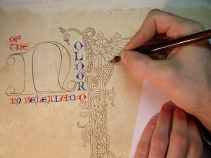 Harff ha svolto prima di iniziare: «Avevo progettato di usare la calligrafia soltanto per una sola iniziale lettera di ogni capitolo. Così ho studiato la History of Middle-Earth, le lettere di Tolkien e soprattutto le sue opere come illustratore: danno molte indicazioni su come immaginava la Terra di Mezzo che non possono essere desunte dagli altri scritti. Ho anche cercato di scoprire cosa ispirò lo scrittore da un punto di visto lirico e visivo. Penso si possa riassumere in una sola parola: la Natura». Tolkien, ovviamente, era anche un amante della calligrafia, soprattutto medievale. «Nel libro J.R.R. Tolkien – Artist and illustrator ho trovato un riferimento a un libro riguardante la calligrafia che lo scrittore aveva letto. Così ho comprato lo stesso libro e mi sono messo a lavorare sodo. Questo è stato il momento di massimo divertimento, mentre mi allenavo ricopiando la calligrafia medievale. Alla fine ho dovuto prendere una decisione: illustrazioni o calligrafia. Non è stato facile, perché avevo fatto già molti bozzetti per le illustrazioni ad olio, ma il tempo era così breve che non potevo fare entrambe le cose. Non rimpiango la mia decisione perché ho fatto l’esame e ho ancora tonnellate di studi preparatori e piastre in legno in attesa di pittura.