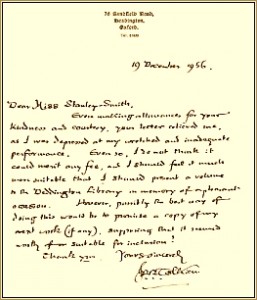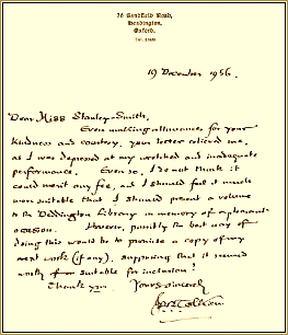 Sull’inaugurazione della biblioteca rimane testimonianza anche in due lettere di Tolkien. Ne fanno riferimento anche Wayne G. Hammond e Christina Scull nel loro volume The J.R.R. Tolkien Companion and Guide (volume I, Chronology, pagine 496-8, 2006). Nella prima, del 22 novembre 1956, lo scrittore accetta l’invito della bibliotecaria, la signora Stansley-Smith, a tenere un discorso, «malgrado non mi faccia piacere parlare (in questo senso), spiegare o rivolgermi a un pubblico». L’invito includeva anche il pranzo, cosa che, scriveva Tolkien, «è per me impossibile rifiutare». Nella seconda lettera, scritta il 19 dicembre e dopo l’inaugurazione, Tolkien ringraziava la bibliotecaria per la sua gentilezza, ma si diceva deluso: «Anche tenendo conto per la vostra gentilezza e cortesia, la tua lettera mi ha sollevato, in quanto ero depresso per la mia prestazione infelice e inadeguata. Anche così, non credo di meritare alcun compenso e troverei molto più adatto che inviassi in dono un mio volume alla biblioteca di Deddington in ricordo di una piacevole occasione… una copia del mio prossimo libro (se ci sarà), potrebbe essere adatta?». Sfortunatamente, negli anni seguenti nessun libro giunse mai a Deddington.
