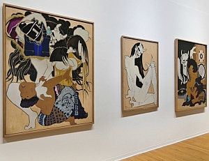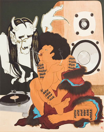 La sua fiaba del XXI secolo narra il “viaggio dell’eroe(ina)” in un elaborato universo di creature fantastiche con lo scopo di creare una storia allegorica radicata nella cultura afro-americana e sintetizzata dall’estetica dell’arte giapponese storica e contemporanea. Le opere sono dipinte con linee forti nello stile delle xilografie Ukiyo-e del periodo Edo realizzate da Tsukioka Yoshitoshi (1839-92). Iona Brown continua la sua indagine sul potere della società dei consumi di minare l’identità individuale. In questa favola epica, lussureggiante e allucinata, le lezioni di dei e dee dell’epoca hip hop sono predicate ai giovani, spesso cadendo nel vuoto. Mondo spirituale e materiale coesistono in un regno caotico del bene contro il male, che è allo stesso tempo contemporaneo e senza tempo.