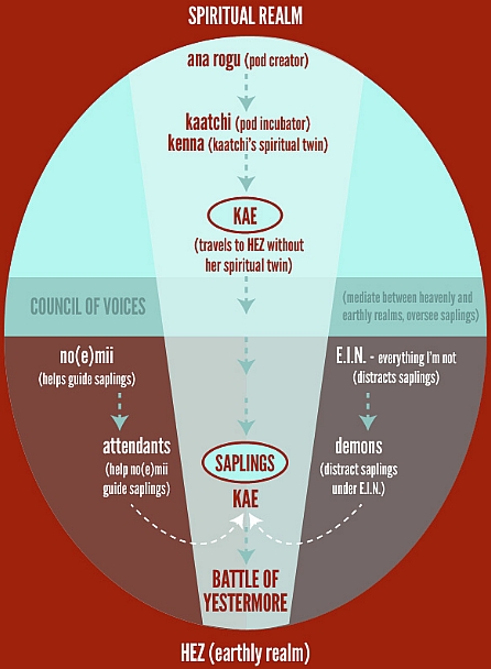 Lo scontro tra le due forze è personificato nel duello allegorico tra Kaen ed Ein. Il grande mondo mitologico di Tolkien è stato fondamentale nella creazione dell’universo personale allegorico dell’artista statunitense, per sua stessa ammissione. Popolato da figure come il guerriero Yoshi, che cavalca una Grande Ruota e indossa un mantello decorato con sigle tipiche dell’hip-hop e Ana Mei (una dei tanti “alberelli” o “adolescenti”, che sta cercando di farsi strada attraverso le distrazioni spesso fatali della vita). Introdotto con un trittico in “All Falls Down” nel 2008, Ein (si pronuncia “ine” ed è l’acronimo di “Tutto quello che non sono”) è una presenza spettrale che riceve ordini da invisibili forze oscure ed è in combutta con i demoni tenta alternativamente con lusinghe e prepotenze le giovani Ana Mei femminili fino a farle cadere nel materialismo e nella promiscuità. Vi suona familiare? Ein era in origine una donna, una creatura che si è poi trasformata fino a divenire un demone. La sua ispirazione diretta è proprio il personaggio di Gollum dello Hobbit e del Signore degli Anelli di Tolkien. La trasformazione di Ein è avvenuta a causa del suo desiderio insaziabile di beni materiali. La sua era ed è un’ossessione per la moda e l’aspetto fisico – questa è una mitologia di oggi!