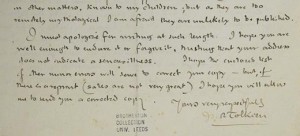 Faceva parte del suo umorismo e credo che pensasse che Ransome si sarebbe divertito della cosa e sarebbe stato al gioco». Hall ha anche spiegato come non fosse insolito per Tolkien creare incongruenze non volute nella sua narrativa e poi utilizzare la sua esperienza accademica per cercare di spiegarle. Tolkien, un’autorità negli studi dell’anglosassone (l’inglese antico), nei suoi libri inventò diverse lingue immaginarie (tra cui le lingue degli Elfi, il Quenya e il Sindarin) usando la sua conoscenza dell’anglosassone, dell’inglese medievale (middle english), del norreno (l’antico islandese) e del gallese medievale. «Nelle sue opere di fantasia, Tolkien ebbe opportunità di creare uno spazio immaginario ideale per la sperimentazione linguistica», ha concluso Hall, «un luogo in cui poteva pensare liberamente alle parole e ai suoni che stava studiando, ma per usarle in un modo in cui non era libero nella realtà a causa dei limiti imposti dalle testimonianze scritte di quelle lingue». E ora sciogliamo l’ultimo mistero che nessuna agenzia ha riportato: a Leeds non esiste alcuna collezione di scritti di Tolkien! Lo scambio di lettere tra i due scrittori è conservato nella Brotherton Collection dell’università di Leeds. Il motivo è semplice: Arthur Ransome nacque e visse fino alla maturità a Leeds, dove studiò anche senza laurearsi