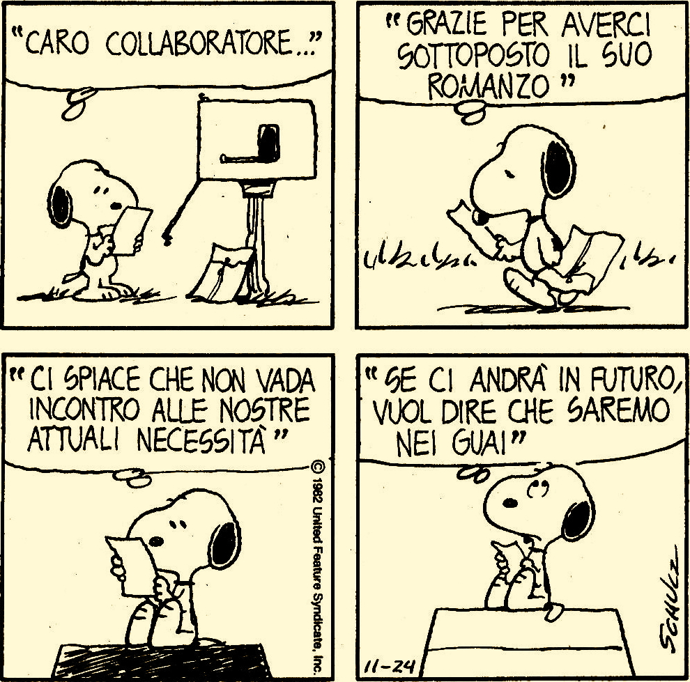 Il mestiere dell’editore è fatto innanzitutto di scelte, e le scelte sono fatte di esclusioni, non sempre così palesemente ingiuste come possono apparire agli occhi dei lettori. In ogni caso, sarà l’arrivo del successo di un’opera a fare tabula rasa di tutte le possibili ragioni di un rifiuto, insieme ai tanti mea culpa dell’editore che se lo è visto sfuggire. Interi libri sono dedicate alle stroncature di autori poi divenuti famosi. Il primo libro con Sherlock Holmes, ricorda lo stesso Conan Doyle, «tornava indietro con la precisione di un piccione viaggiatore». Persino Virginia Woolf rifiutò Ulisse di Joyce per la sua casa editrice Hogarth Press e definì lo scrittore «un liceale a disagio che si gratta i foruncoli». Nonostante questo, Ulisse resta un monumento della narrativa novecentesca. Tra i moltissimi esempi nostrani, si può citare Italo Calvino che fu bocciato nel 1949 da Elio Vittorini per il romanzo Bianco veliero. Vittorini così lo stroncò: «C’ è una gran fretta da bambocciata. C’è infantilismo e basta». Vittorini bocciò anche Il Gattopardo e fu recidivo perché lo fece in due occasioni per editori diversi. Lo scrittore, traduttore e direttore di collane siciliano non viene in mente a sproposito: fu, infatti, proprio Vittorini a suggerire nel 1962 alla casa editrice Mondadori di “scartare” Il Signore degli Anelli di Tolkien. «Dopo una lunga discussione interna», in accordo con Vittorio Sereni, bocciò Tolkien scrivendo: «Escluderei la possibilità di arrischiare un esperimento» (si può leggere l’articolo qui).