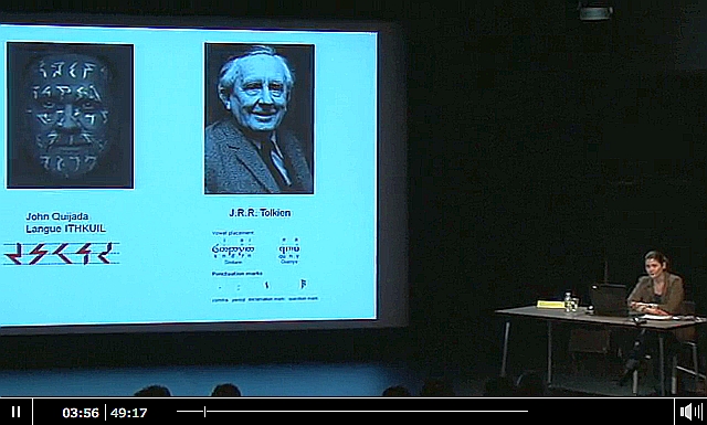 Tolkien e le sue creazioni linguistiche sono state al centro anche di una conferenza, intitolata Mythopoétiques (“Mitopoietica”, l’arte di inventare i miti), tenuta dalla storica dell’arte Mihaela (Miha) Gherghescu, insegnante all‘EHESS, l’École des Hautes Études en Sciences Sociales (la Scuola di Studi Superiori in Scienze Sociali). Il suo intervento che è possibile seguire seguendo il collegamento qui sotto, non è semplice il riflesso di una ricerca accademica, ma una rassegna di quegli autori che si sono proposti a un certo momento di riformare la sostanza profonda del nostro linguaggio. Non si tratta di colmare le lacune o di confermare le teorie che circolano sulle lingue inventate, ma semplicemente di porre all’attenzione del pubblico la pluralità e la ricchezza di queste costruzioni artistiche, mitiche e al tempo stesso poetiche, che mutano profondamente la nostra abitudine a leggere, sentire e vedere che hanno provocato e provocano ancora, tutta una serie di processi di identificazione, di assegnazione e di riconoscimento. Queste creazioni mettono in gioco, tutti in una volta, i presupposti sulla stabilità del testo e sulla chiarezza dell’immagine. Tra questi autori un posto preminente è dedicato a Tolkien, descritto come professore di Oxford appassionato di elfi, hobbit e goblin, ma anche di leggende arturiane, di poemi anglosassoni e di saghe finlandesi che fu un grande inventore di lingue fantastiche, un teorico di un’estetica linguistica per il suo Sindarin e il suo Quenya, un esploratore di tutte le permutazioni linguistiche possibili e fittizie che letteralmente erano il frutto di una “azione mitopoietica”: le sue lingue hanno prodotto la creazioni di interi popoli, territori e un intero universo che le usava e che le modificava nel corso del tempo, come testimonia la normale evoluzione di un linguaggio reale.
