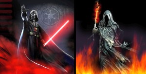 Continuiamo avvicinando il Re Stregone di Angmar (ing. Witchking) a Darth Vader, entrambi erano uomini prima di essere assoggettati dal Male, sia esso il potere di Sauron o il Lato Oscuro della Forza. Seguitiamo con un caso a dir poco curioso… Due forti personaggi appartenenti alla fazione del Bene, che successivamente si convertono al lato maligno: Saruman e Dooku. Il primo è il capo del Bianco Consiglio (alto comando dei Popoli Liberi nella Terra di Mezzo dove siedono i più potenti tra gli Eldar e gli Istari), del quale è anche il membro più saggio e potente, che in seguito si insedierà a Isengard, creando eserciti di Orchi per conquistare la Terra di Mezzo ed aiutare così l’Oscuro Signore. Dooku, uno dei più forti Jedi della storia, allievo di Yoda e maestro di Qui-Gon Jinn, abbandona l’Ordine dei Jedi abbracciando il Lato Oscuro della Forza sino a divenire Signore Oscuro dei Sith. La curiosità sta nel fatto che sul grande schermo i personaggi sono interpretati dallo stesso grande attore: Sir Christopher Lee.