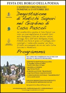 La festa sarà una vera e propria «degustazione di antichi sapori», come hanno spiegato all’ArsT gli organizzatori. Le porte del Giardino di casa Pascoli e della casa-museo saranno però aperte fin dal mattino, a disposizione per visite guidate gratuite, e ospiteranno, all’ora di pranzo, quello che tra gli addetti ai lavori viene chiamato “convivio”: un pranzo itinerante a base di prodotti tipici della Garfagnana e Valle del Serchio: salumi, formaggi, farro i.g.p. della Garfagnana, trippa, frittelle con farina di grano e di neccio, dolci e le immancabili caldarroste. Il tutto annaffiato dai vini d.o.c. delle Colline Lucchesi e di Montecarlo. Se il pranzo è a misura di hobbit, il programma del pomeriggio sarà più culturale. Graziella Cosimini dell’Istituto storico lucchese, autrice Giovanni Pascoli “Fotografo” (Barga 1996) leggerà le liriche di Pascoli. Alla manifestazione sarà presente anche il