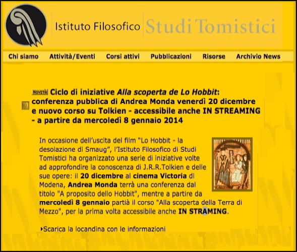 Parte oggi il nostro nuovo ciclo di lezioni a Modena! «Alla scoperta della Terra di Mezzo» è il secondo ciclo dei seminari organizzati dall’Istituto filosofico di studi tomistici, in collaborazione con l’ArsT, all’interno del programma di corsi 2014 su j.R.R. Tolkien a Modena, Bologna e Roma. Dopo l’anteprima del 20 dicembre al cinema Victoria di Modena, in cui una sala esaurita in ogni ordine e posto a ascoltato Andrea Monda parlare A proposito dello Hobbit, il corso parte stasera, 8 gennaio, e fino al 12 febbraio 2014 prevede una lezione settimanale, il mercoledì sera dalle 21 alle 23. Il programma è ricco di interventi e ha lo scopo di illuminare i tanti aspetti meno noti delle opere del Professore di Oxford che spaziano dalle lingue alla musica, dagli abiti alla produzione di fan film, senza dimenticare i personaggi e i mostri: un focus particolare sarà dedicato, infatti, a Tom Bombadil, forse il più enigmatico dei tanti attori del capolavoro tolkieniano, mentre un’analisi approfondita sarà concentrata sull’influenza che il drago Smaug ha avuto su contemporanei ed eredi dello scrittore inglese. Iscrizioni alle lezioni: 10 euro a lezione. Ci si può iscrivere anche la sera stessa delle singole lezioni dalle 20.45 alle 21.00. Si può scaricare la locandina del corso qui.