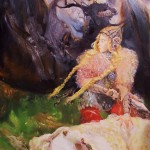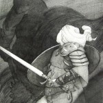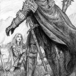 Mi ha veramente colpito questa versione di Eowyn: più che una guerriera con armatura splendente e armi scintillanti è una donna in una società guerriera, con armatura vissuta e portata abitualmente. L’arma e l’elmo sono molto realistiche per una donna. La tecnica, inoltre, è bellissima: sembra un acquarello…