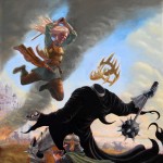 3° Gordon Napier: sebbene io preferisca i lavori a colori, come dimostrano le mie prime due scelte, questo qua ha qualcosa che ha catturato la mia attenzione. In primis, la disperazione di Eowyn è palpabile, sia per il suo volto, sia per il fatto che il braccio rotto ha cominciato a farle male, segnale che qualsiasi scorta di adrenalina avesse avuto fino a quel momento è finita. Il secondo punto, è che non vediamo il volto del Witch King, lasciando che sia la fantasia dello spettatore ha “riempire” quel vuoto i cui confini sono delimitati dall’armatura. Infine, adoro il fatto che, dato che vediamo il Witch King di spalle, probabilmente stiamo assistendo alla scena dal punto di vista di Merry, poco prima che pugnalasse il Witch King!