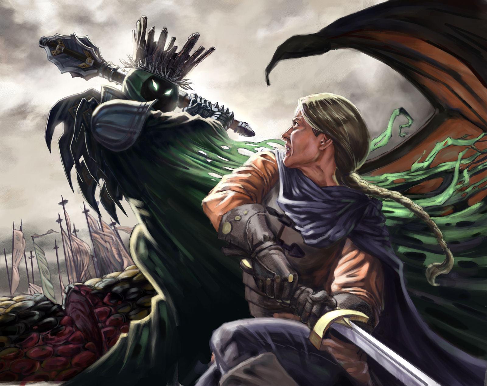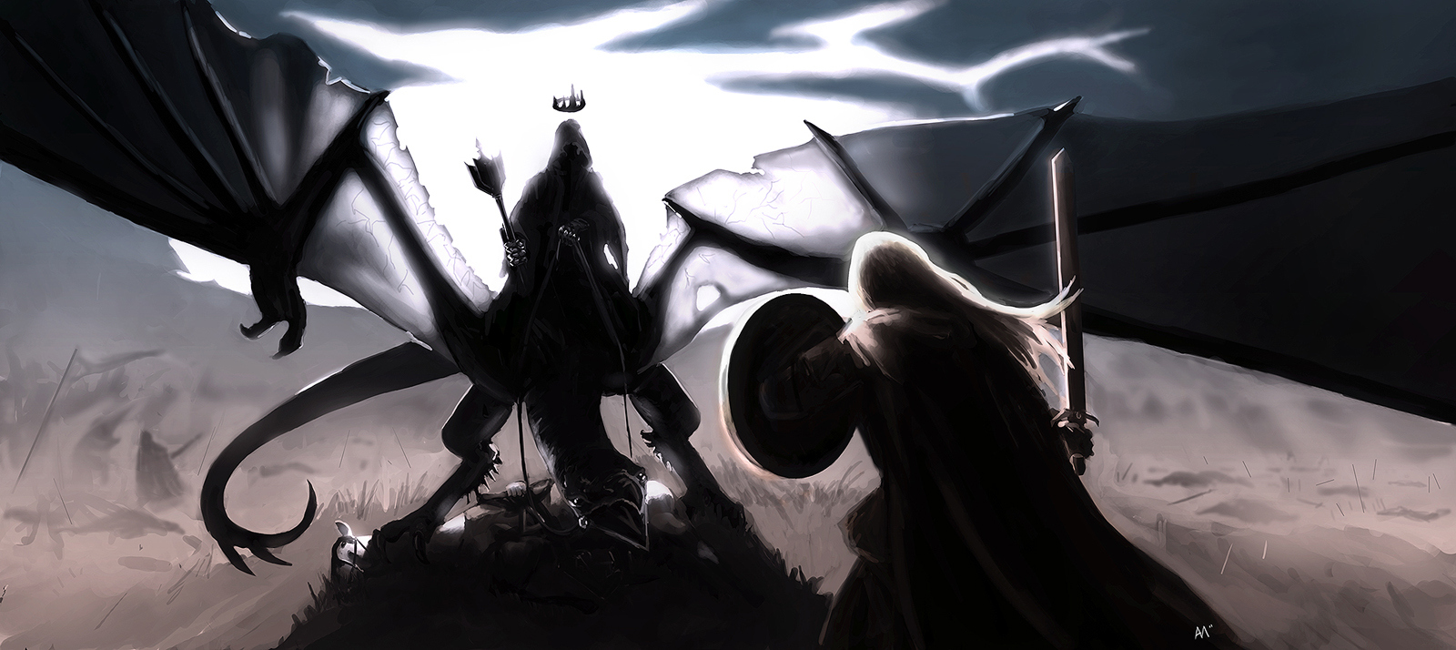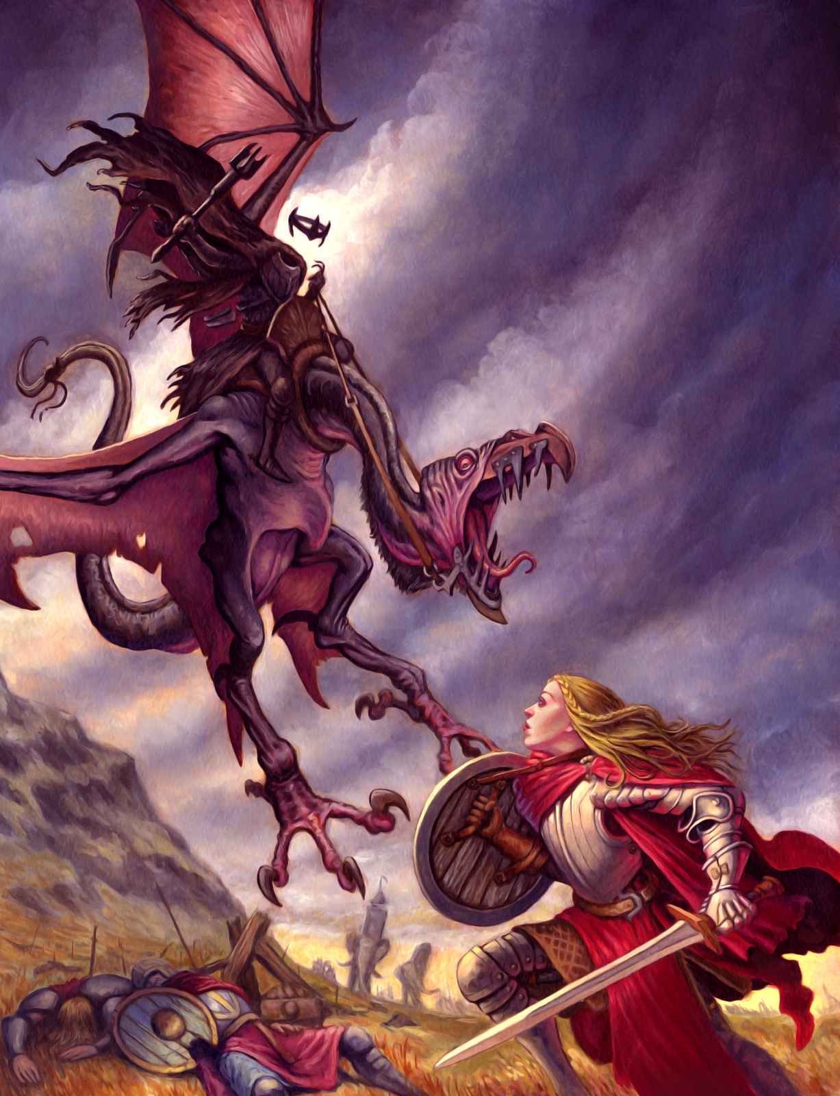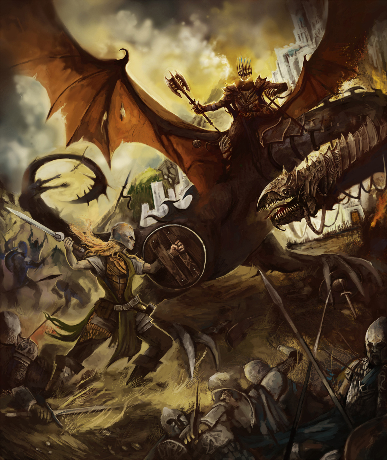 Avvrebbero dovuto essere assegnati quattro posti agli artisti (sì, c’è anche la medaglia “di legno”!), ma avendo Ryan e Dyson ottenuto le stesse preferenze, abbiamo deciso di non assegnare il 4° posto e premiare i due artisti a pari merito. Viste le scelte, non posso non dare il mio commento ufficiale all’illustrazione di Silver (qui a destra): «Devo dire che l’illustrazione vincitrice è veramente bella nonostante non si veda il viso di Eowyn. Le cose che forse hanno colpito sono state l’uso sapiente del colore, il fatto che ci si senta completamente avvolti dalle ali della cavalcatura e la maestria nel dare movimento alla figura femminile».
