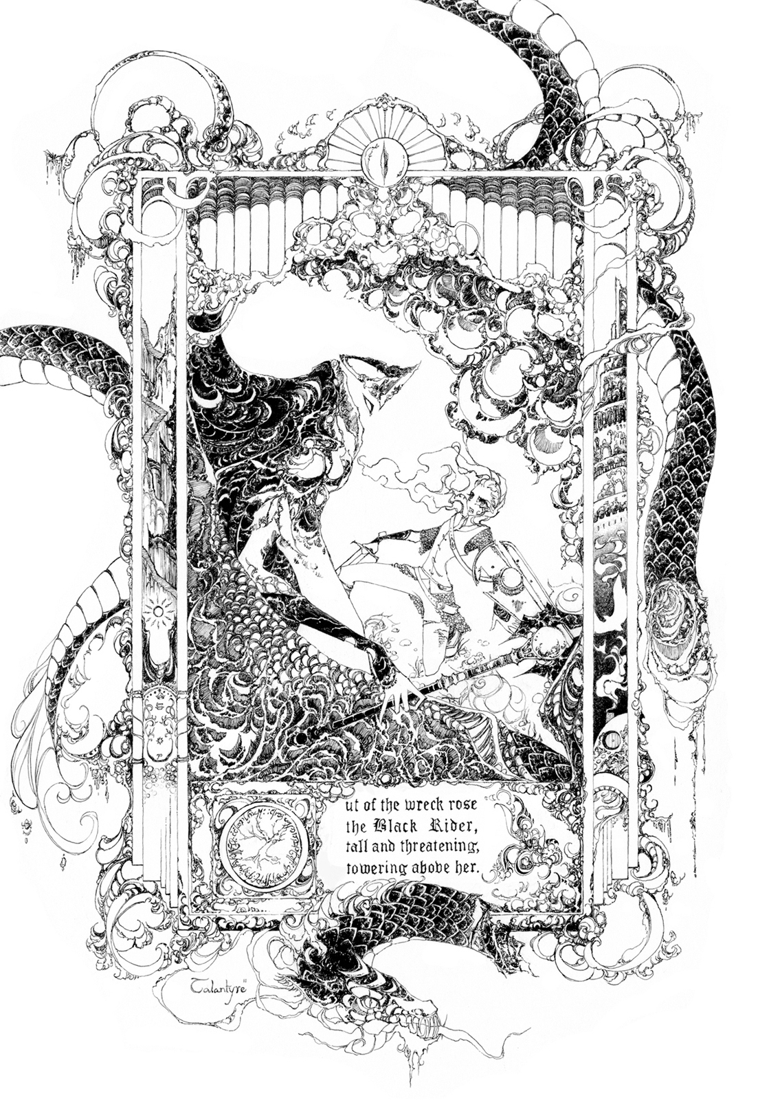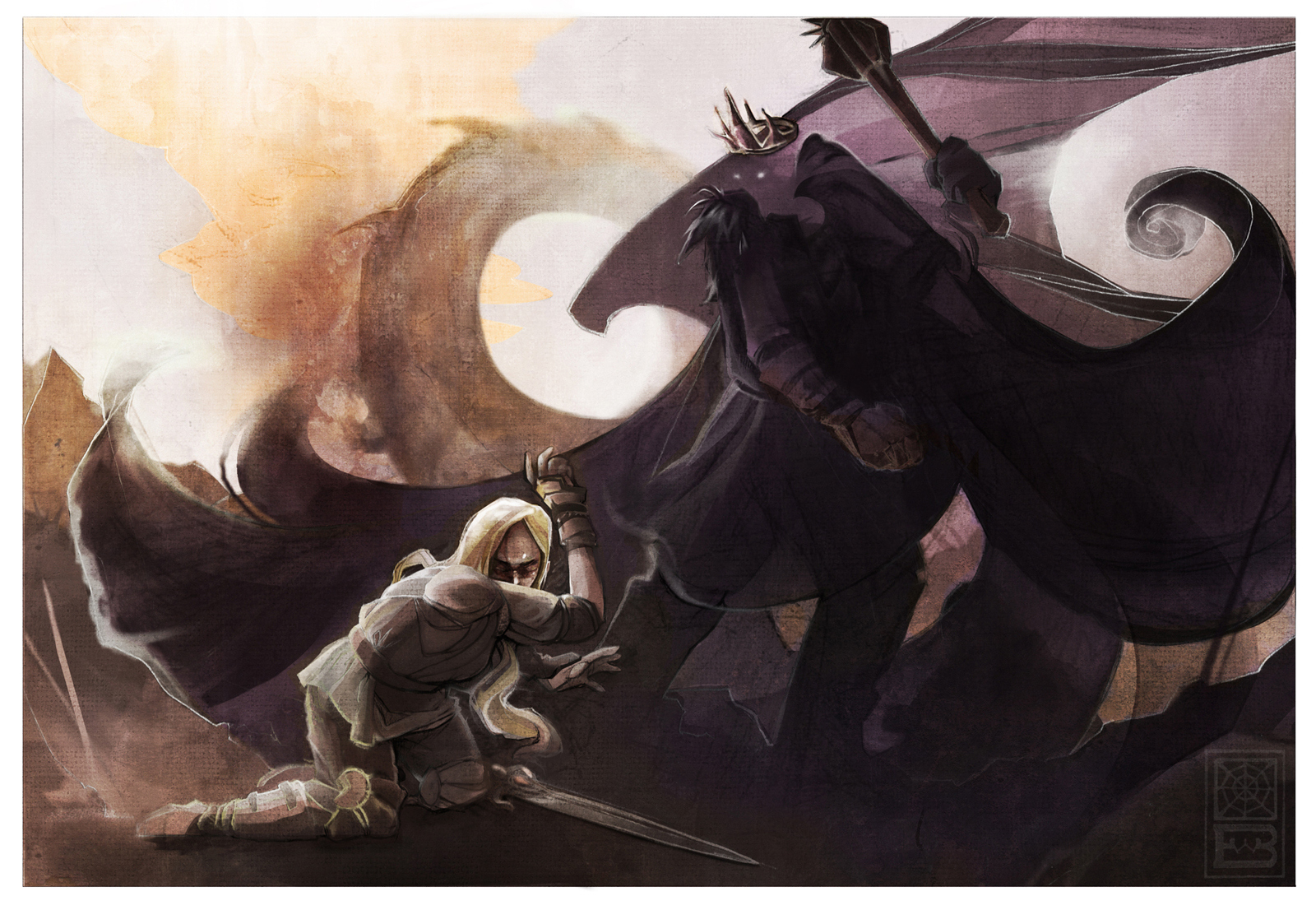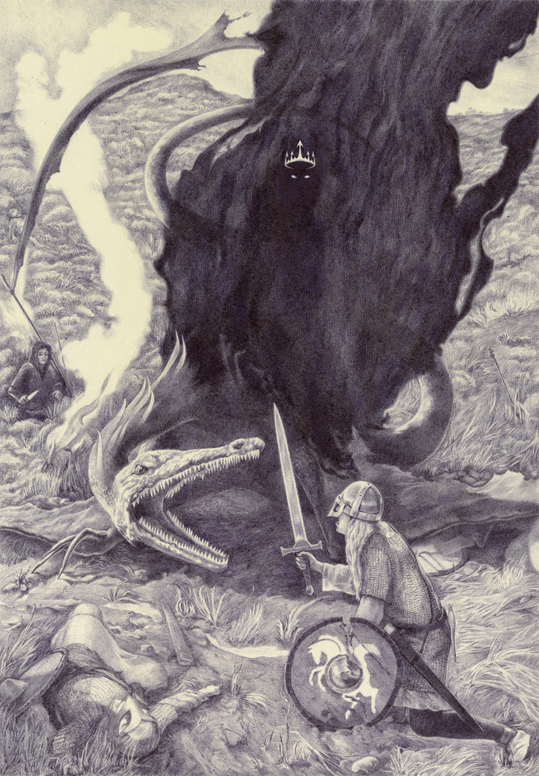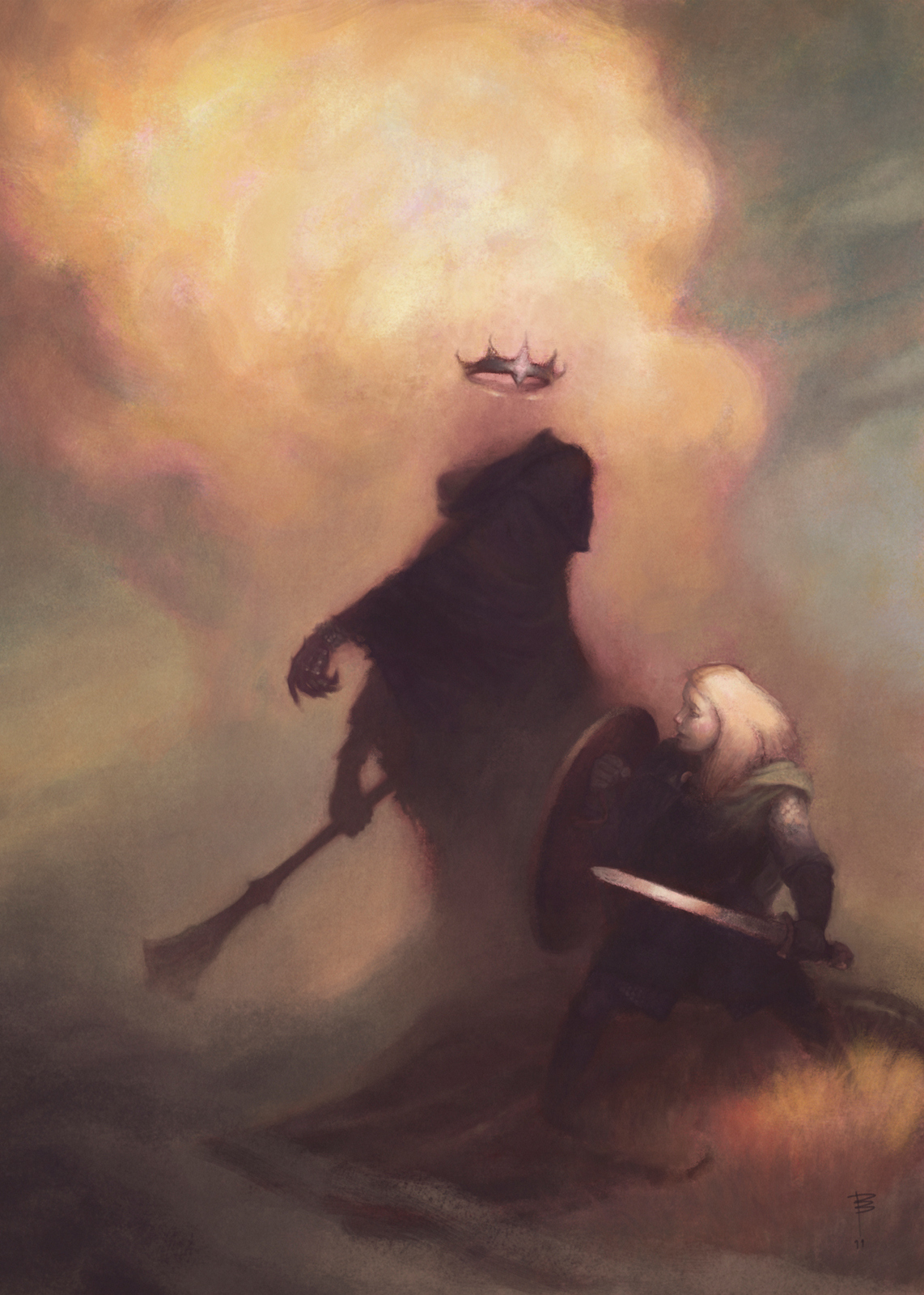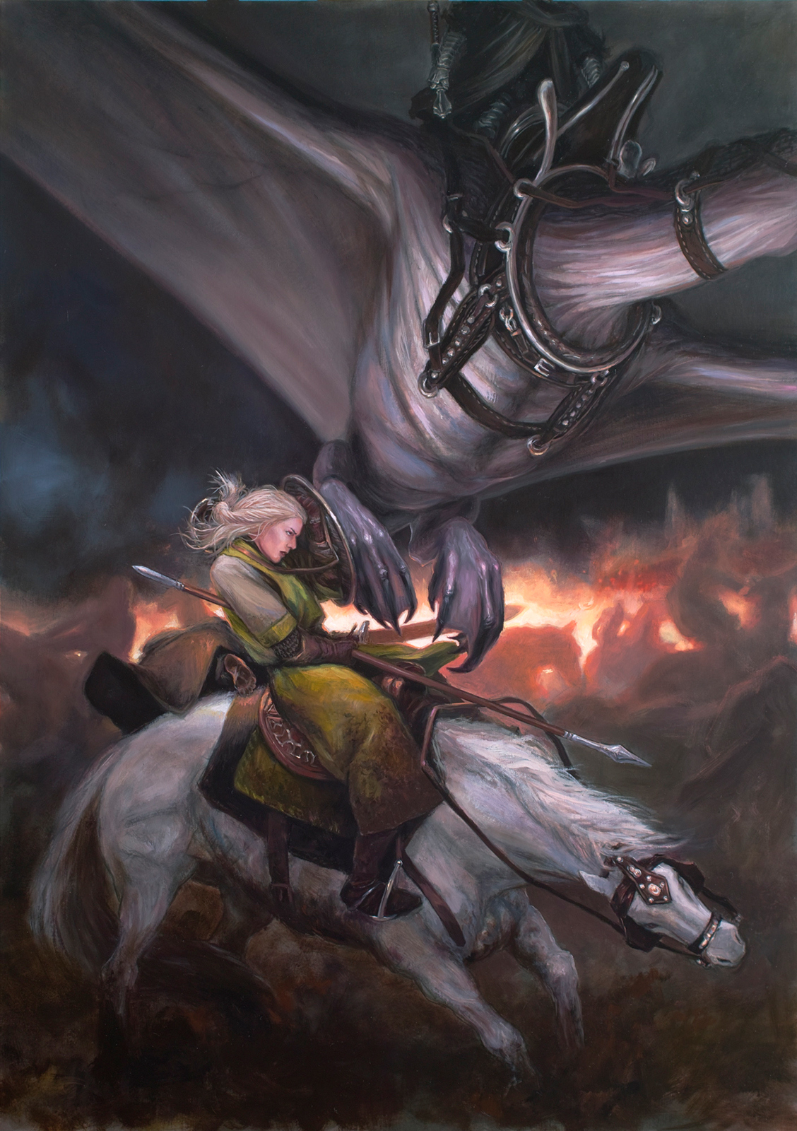 Il tratteggio evidente e il punto di luce concentrato solo su Éowyn la rendono un’illustrazione molto cupa e potente, perfetta nel comunicare il dramma e la tensione del momento rappresentato.