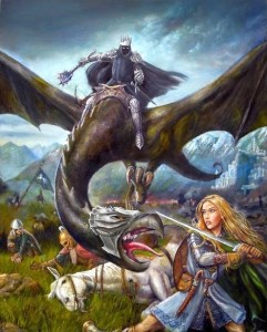 Ma una cosa la posso dire: è ottimo che Eowyn sia rappresentata di spalle: l’autore non ce la mostra come fosse una sua donna ideale, tratteggiandone le fattezze;