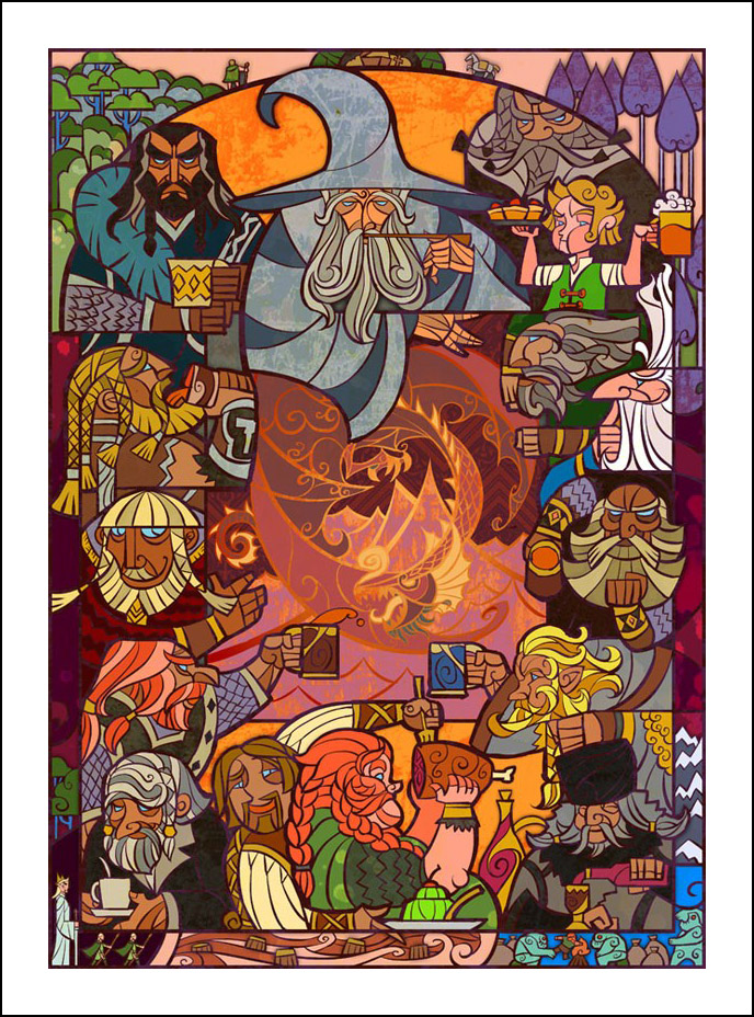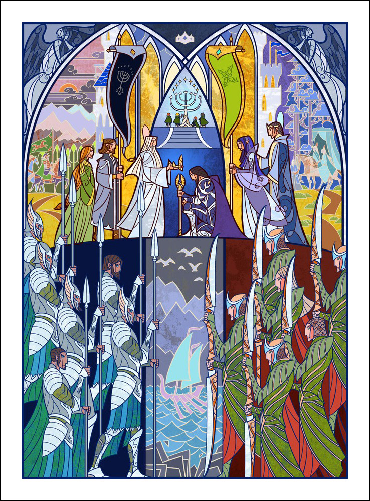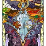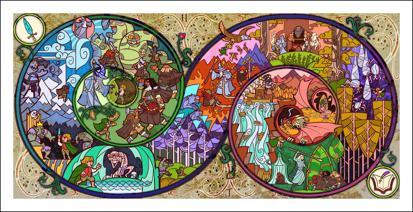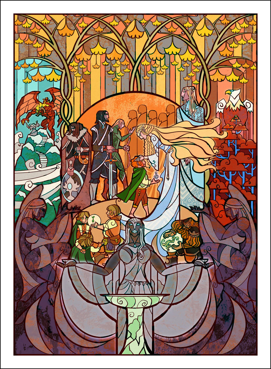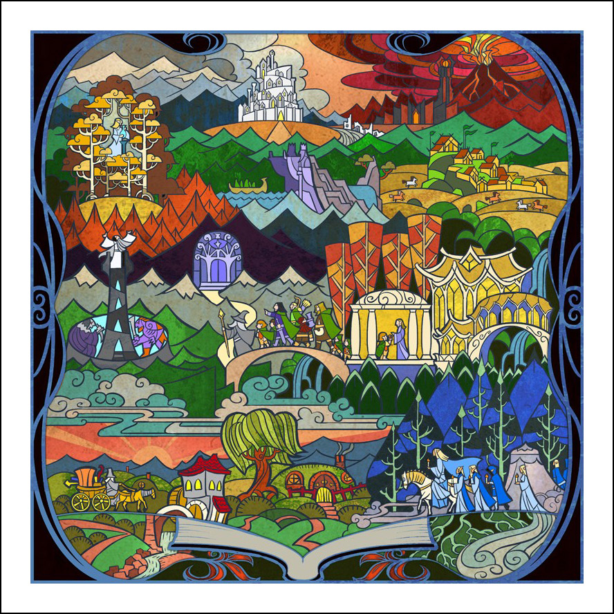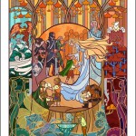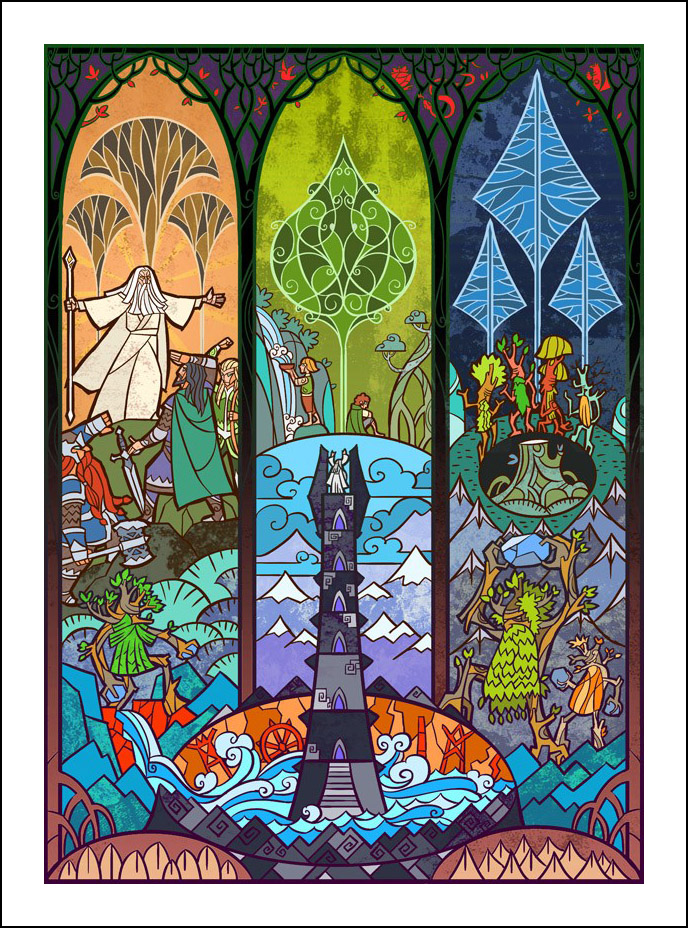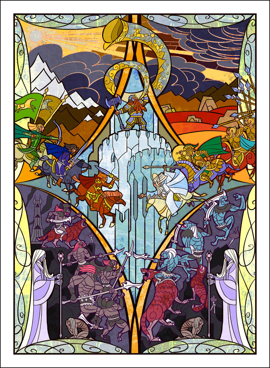 faceva l’illustratore. Sin dall’inizio è stato impressionato ed incuriosito dalla tecnica della pittura e costruzione delle vetrate. L’incontro con le storie di J.R.R. Tolkien è avvenuto con la visione della trilogia cinematografica di Peter Jackson dedicata al Signore degli Anelli. Dopo aver visto i film, Guo a iniziato a leggere il capolavoro dello scrittore ingelse, per poi passare allo Hobbit, ma ammette che solo dopo diverse riletture è riuscito veramente ad approfondire la conoscenza della Terra di Mezzo. Ora ogni due anni legge i libri di Tolkien senza riuscire a staccarsi nemmeno per dormire! Perché illustrare la Terra di Mezzo utilizzando le vetrate? Tradizionalmente, le vetrate sono destinate a immortalare le grandi gesta e gli atti eroici, per non parlare dell’alone di magia e misticismo che le circonda. Grazie alla sua conoscenza della pittura su vetro, Guo è riuscito a dare un senso di sacralità alle storie, riuscendo a trasporre un intero capitolo dei libri in un’unica illustrazione. Ed è proprio la tecnica di raffigurazione, che sarebbe perfetta per essere riprodotta su un vetro reale, a creare l’armonia delle linee e dei colori rendendole decisamente affascinanti. Sebbene l’artista cinese sia attivo e pubblichi le sue illustrazioni fin dal 2011, ha ottenuto una certa notorietà solo dopo che sono state pubblicizzate sul sito web dell’Huffington Post nel settembre 2012. Godiamoci le sue immagini che, se guardate attentamente, rivelano un’ispirazione ai film di Peter Jackson. Buona visione!