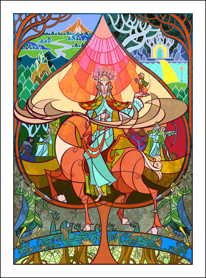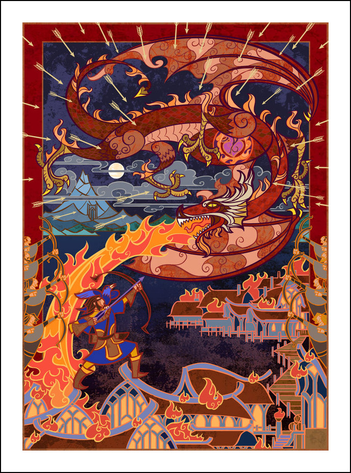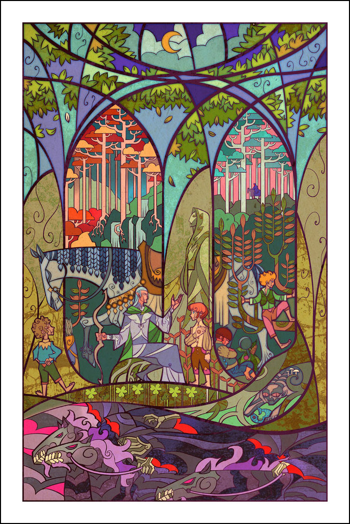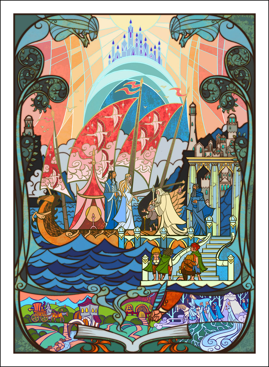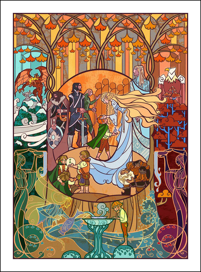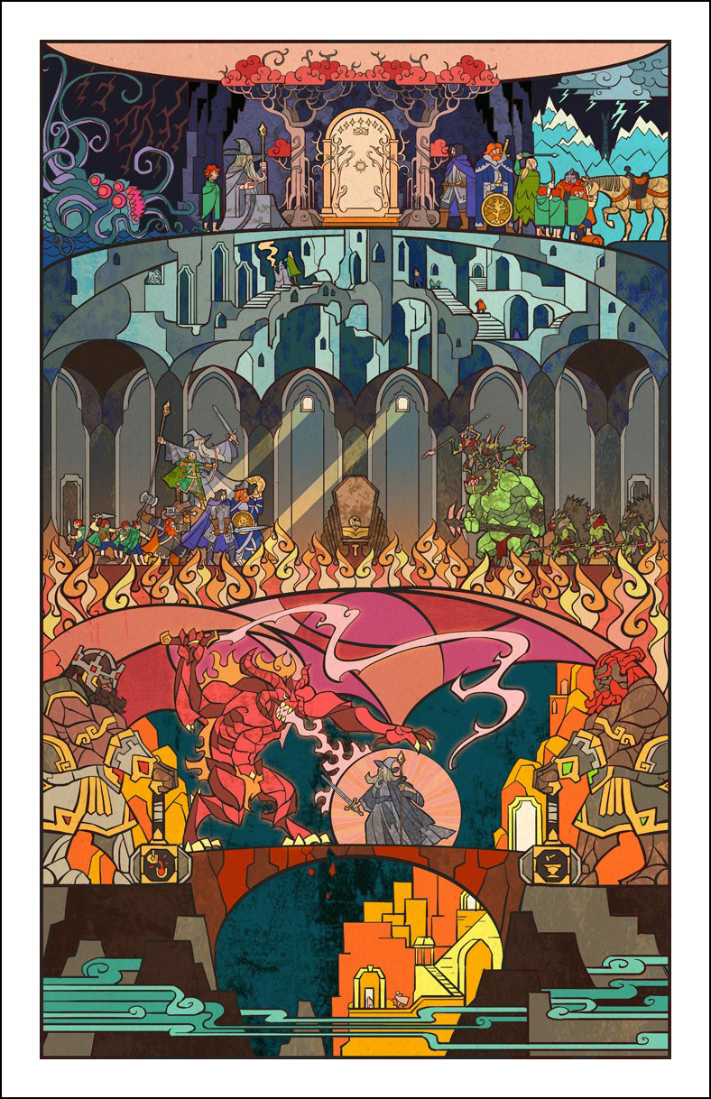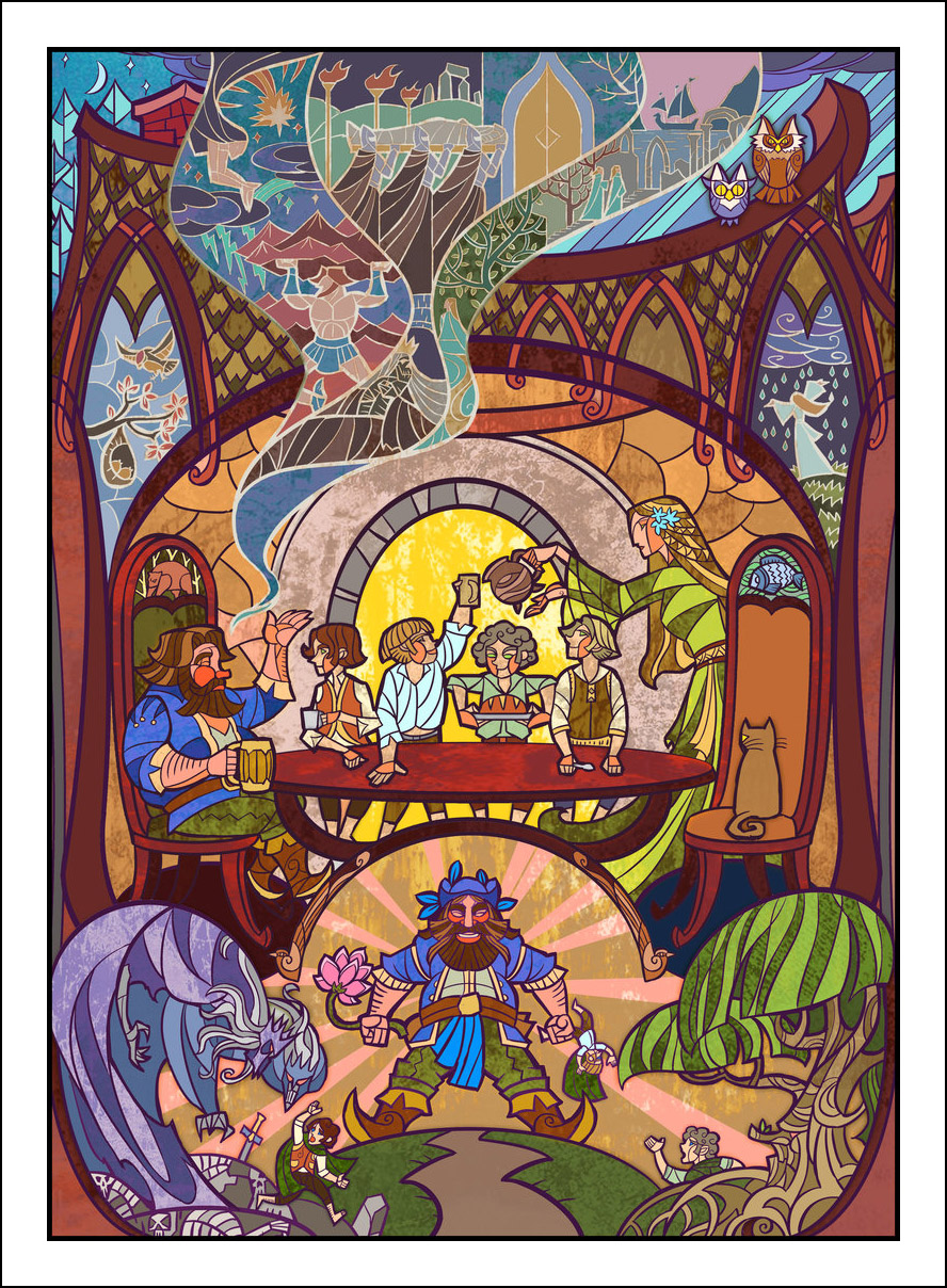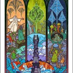 faceva l’illustratore. Sin dall’inizio è stato impressionato ed incuriosito dalla tecnica della pittura e costruzione delle vetrate. L’incontro con le storie di J.R.R. Tolkien è avvenuto con la visione della trilogia cinematografica di Peter Jackson dedicata al Signore degli Anelli. Dopo aver visto i film, Guo a iniziato a leggere il capolavoro dello scrittore ingelse, per poi passare allo Hobbit, ma ammette che solo dopo diverse riletture è riuscito veramente ad approfondire la conoscenza della Terra di Mezzo. Ora ogni due anni legge i libri di Tolkien senza riuscire a staccarsi nemmeno per dormire! Perché illustrare la Terra di Mezzo utilizzando le vetrate? Tradizionalmente, le vetrate sono destinate a immortalare le grandi gesta e gli atti eroici, per non parlare dell’alone di magia e misticismo che le circonda. Grazie alla sua conoscenza della pittura su vetro, Guo è riuscito a dare un senso di sacralità alle storie, riuscendo a trasporre un intero capitolo dei libri in un’unica illustrazione. Ed è proprio la tecnica di raffigurazione, che sarebbe perfetta per essere riprodotta su un vetro reale, a creare l’armonia delle linee e dei colori rendendole decisamente affascinanti. Sebbene l’artista cinese sia attivo e pubblichi le sue illustrazioni fin dal 2011, ha ottenuto una certa notorietà solo dopo che sono state pubblicizzate sul sito web dell’Huffington Post nel settembre 2012. Godiamoci le sue immagini che, se guardate attentamente, rivelano un’ispirazione ai film di Peter Jackson. Buona visione!