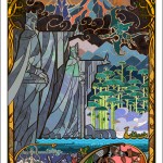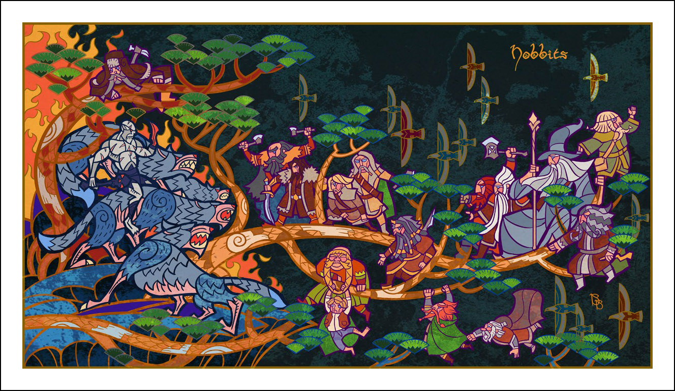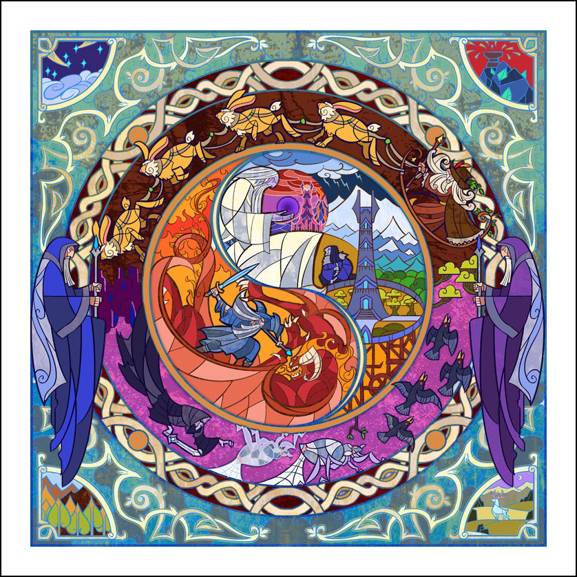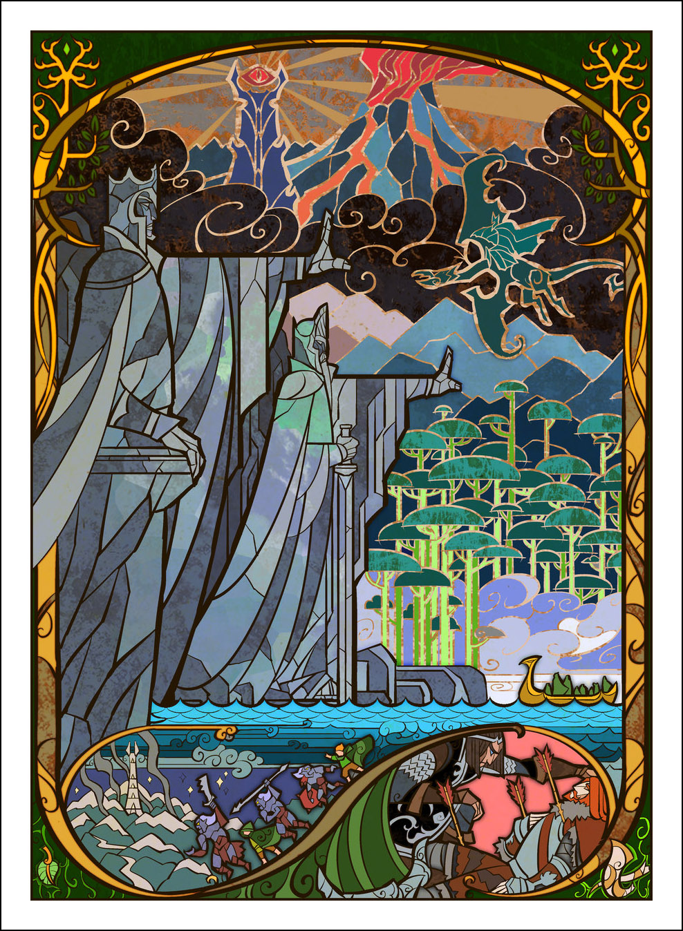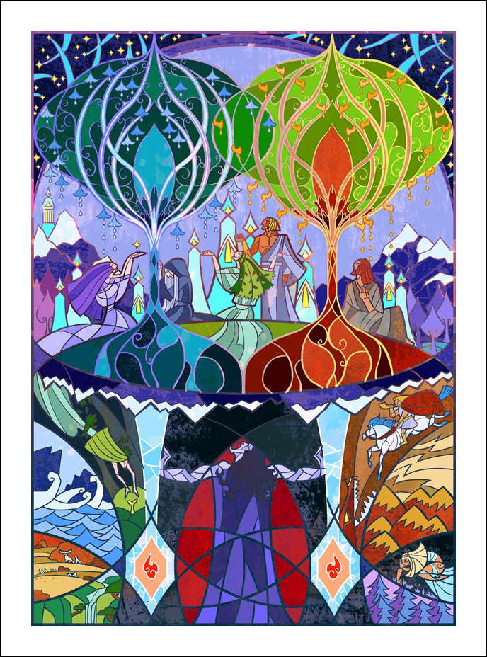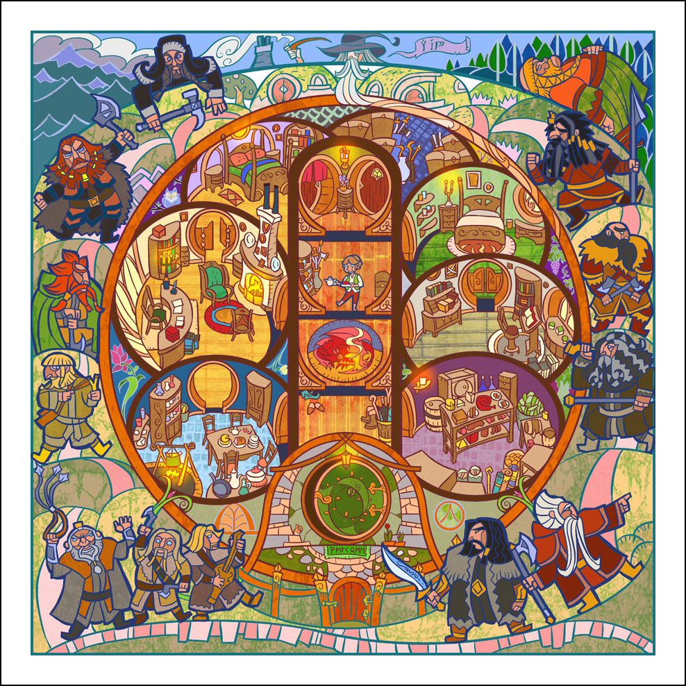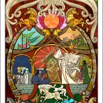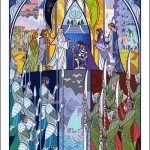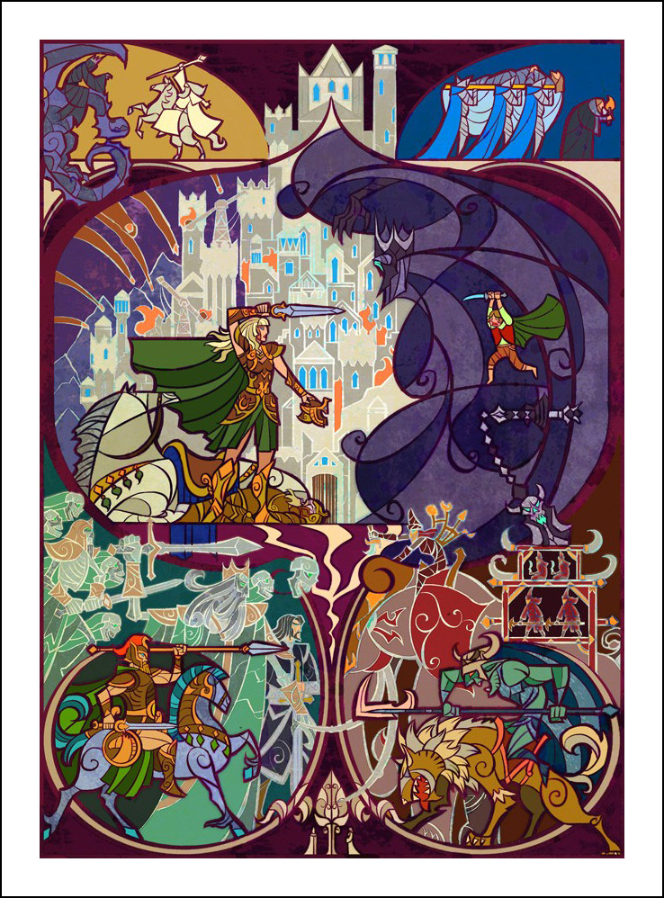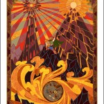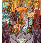 faceva l’illustratore. Sin dall’inizio è stato impressionato ed incuriosito dalla tecnica della pittura e costruzione delle vetrate. L’incontro con le storie di J.R.R. Tolkien è avvenuto con la visione della trilogia cinematografica di Peter Jackson dedicata al Signore degli Anelli. Dopo aver visto i film, Guo a iniziato a leggere il capolavoro dello scrittore ingelse, per poi passare allo Hobbit, ma ammette che solo dopo diverse riletture è riuscito veramente ad approfondire la conoscenza della Terra di Mezzo. Ora ogni due anni legge i libri di Tolkien senza riuscire a staccarsi nemmeno per dormire! Perché illustrare la Terra di Mezzo utilizzando le vetrate? Tradizionalmente, le vetrate sono destinate a immortalare le grandi gesta e gli atti eroici, per non parlare dell’alone di magia e misticismo che le circonda. Grazie alla sua conoscenza della pittura su vetro, Guo è riuscito a dare un senso di sacralità alle storie, riuscendo a trasporre un intero capitolo dei libri in un’unica illustrazione. Ed è proprio la tecnica di raffigurazione, che sarebbe perfetta per essere riprodotta su un vetro reale, a creare l’armonia delle linee e dei colori rendendole decisamente affascinanti. Sebbene l’artista cinese sia attivo e pubblichi le sue illustrazioni fin dal 2011, ha ottenuto una certa notorietà solo dopo che sono state pubblicizzate sul sito web dell’Huffington Post nel settembre 2012. Godiamoci le sue immagini che, se guardate attentamente, rivelano un’ispirazione ai film di Peter Jackson. Buona visione!