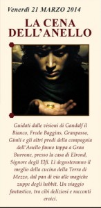 Leggendo le pagine del Signore degli Anelli, Lo Hobbit e il Silmarillion si scopre che i protagonisti mangiano sempre. Si trovano molti alimenti citati, dalle patate, al ragù, all’idromele. Inutile dire che i più ingordi sono gli Hobbit, mentre i più attenti alla dieta sono gli Elfi, che non consumano burro, preferendo idromele e lembas, mentre i Troll si accontentano di abbacchio arrosto e birra. Da questo spunto è nata l’idea de La cena dell’Anello, che vedrà lo chef Fabrizio Donati cimentarsi in un menù ispirato alla Terra di Mezzo, con pietanze che richiamano il mondo degli Hobbit e degli Elfi. Intorno al tavolo siederanno anche alcuni personaggi della saga, a cominciare da Frodo Baggins, Gandalf il Mago ed Aragorn il Ramingo.