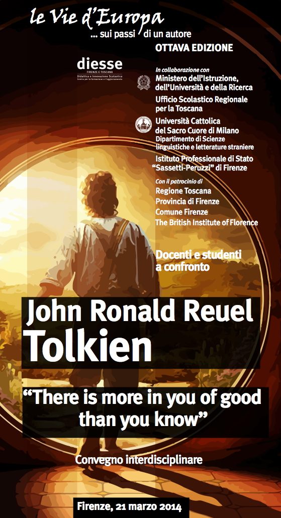 L’ottava edizione delle Vie d’Europa ha il suo focus nel convegno-concorso su Tolkien, dal titolo There is more in you of good than you know. Agli studenti il compito di presentare elaborati suddivisi in quattro sezioni: saggi in italiano, testi teatrali o racconti in italiano, testi in lingua inglese ed elaborati artistici, tutti rigorosamente scaturiti dalla loro creatività. Ai primi tre classificati per ciascuna ezione a concorso andranno premi in denaro. Le giurie sono presiedute da Annalisa Teggi (Università Aperta), Amanda Clare Murphy e Giuliana Bendelli (Universita’ Cattolica del Sacro Cuore di ilano) e Mattia Zupo (Universita’ di Firenze). La manifestazione si svolge dalle 9 al Centro Spazio Reale, in via San Donnino a Firenze, ed è realizzata in collaborazione col ministero dell’ istruzione, dell’università e della ricerca, con l’ufficio scolastico regionale per la Toscana, con l’istituto professionale “Sassetti – Peruzzi” di Firenze e con il patrocinio di Ansas (ex Indire), del dipartimento di scienze linguistiche e letterature straniere dell’Universita’ Cattolica del Sacro Cuore di Milano, del British Institute of Florence, della Regione Toscana, della Provincia e del Comune di Firenze.