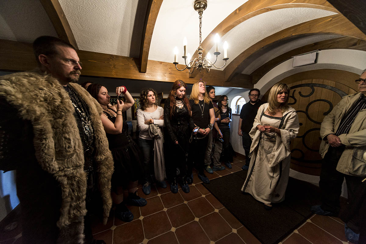 Oltre a me e Ivan, anche lo stesso Greisinger vuole essere presente alla visita del primo tour italiano, insieme alla guida ufficiale Enza Donatsch Sava e a Simone Gallotti: molti di noi vestono un costume a tema, così da accompagnare i visitatori nel loro viaggio nel miglior modo possibile. L’occasione del primo tour organizzato, é veramente un evento importante e la prima giornata calda di primavera contribuisce a renderla ancora più memorabile. Il gruppo è rimane nel museo un intero pomeriggio, tanta è la curiosità di conoscere i dettagli delle opere esposte, i dipinti, i pezzi rari da collezione, le opere e le scenografie. Alla sera una cena in stile hobbit in un localino vicino al museo, con risate birra e vino, poi dritti in Hotel a dormire. Il giorno seguente, una sosta è stata fatta al Giger Bar di Coira (realizzato dal compianto padre dei tre film di Alien, Hans Ruedi Giger, progettista e creatore dello Xenomorfo e di tutto l’universo alieno) e una seconda tappa per la visita al Castel Grande di Bellinzona, nonostante la pioggia, mettono la firma a questo incredibile viaggio nella Terra di Mezzo. Una scommessa riuscita? Un esperimento da rifare? Penso proprio di si… Eravamo titubanti e preoccupati per le difficoltà organizzative e l’eterogeneità del gruppo, ma la realtà ha superato le aspettative. Ci ritorneremo? Sicuramente si… Andata e Ritorno… (dall’Italia)