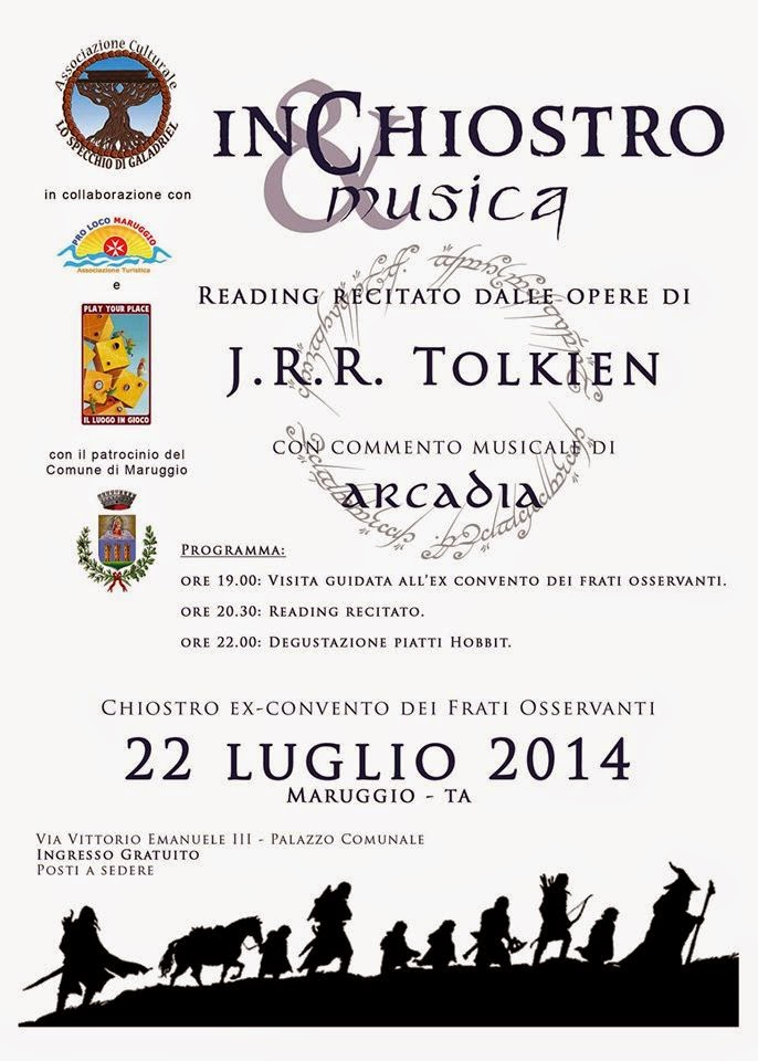 Tolkien va anche in Puglia. L’associazione culturale Lo Specchio di Galadriel, in collaborazione con la Pro Loco di Maruggio, borgo medievale in provincia di Taranto, e l’associazione di promozione sociale Play Your Place – Il Luogo in Gioco, organizza per il 22 luglio prossimo un evento all’insegna di J.R.R. Tolkien. Intitolato InChiostro & Musica, vedrà svolgersi un reading recitato dalle opere dello scrittore inglese con commento musicale del gruppo Arcadia. La serata sarà aperta dalla visita guidata all’ex-convento dei frati osservanti e alla annessa chiesa di Santa Maria delle Grazie e conclusa con la degustazione di alcuni piatti tipici degli Hobbit. Verranno recitati alcuni brani tratti da Il Signore degli Anelli, Il Silmarillion e Lo Hobbit, con l’intervento di Arcadia che proporrà alcuni brani del proprio repertorio tolkieniano.