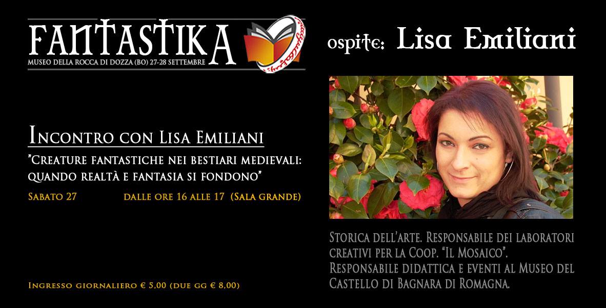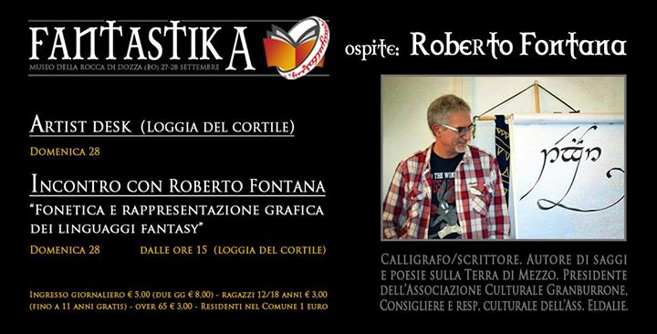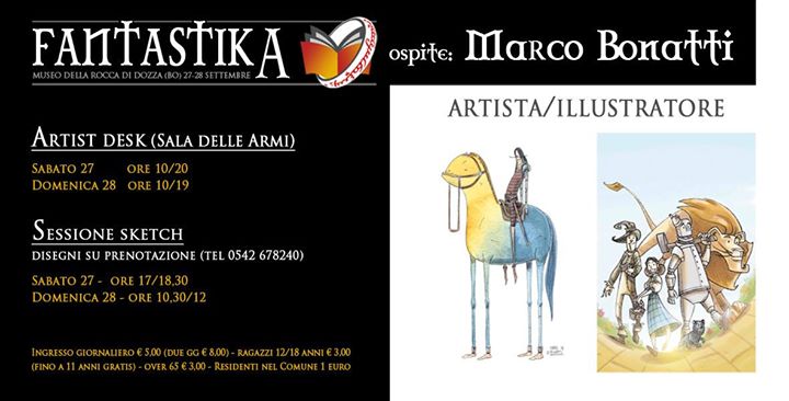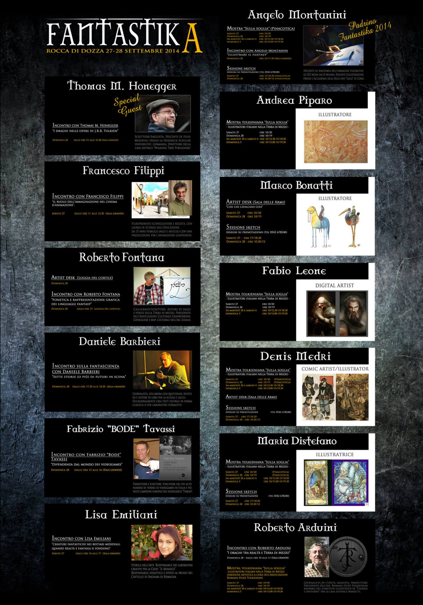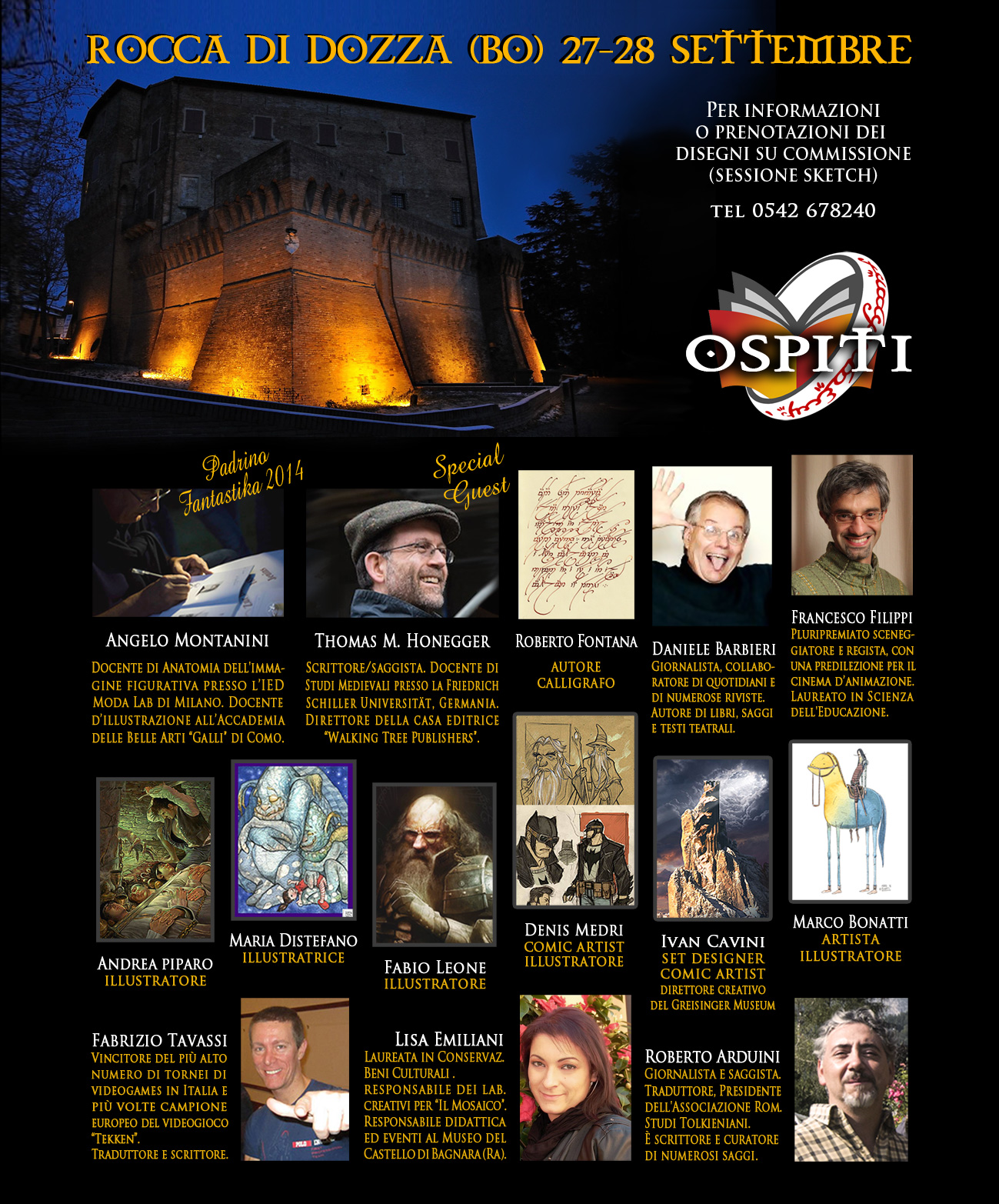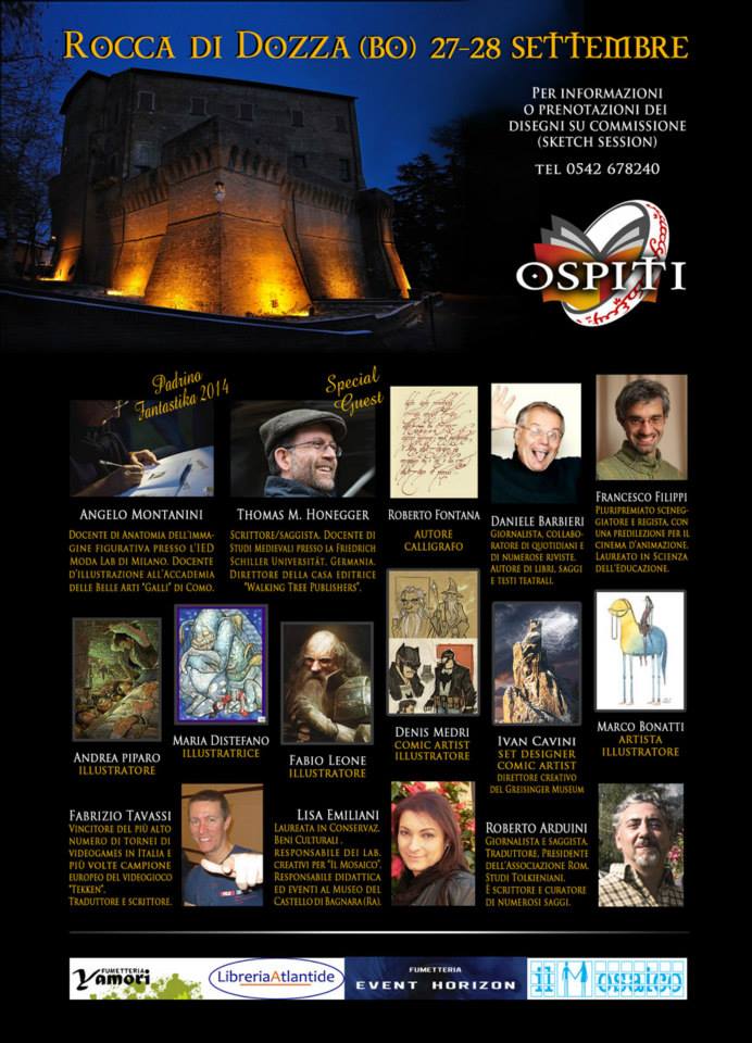 Con i suoi film ha all’attivo più di 150 premi e 400 selezioni ai festival in tutto il mondo. I suoi corti più conosciuti sono Home (2009) e Gamba Trista (2010) e Memorial (2013). Per i fumetti l’illustratore e cartoonist Marco Bonatti, disegnatore per la Cyrano Comics e colorista per Bonelli del fumetto Zagor, presenterà il suo originale progetto Così che cavalcano cose, mentre le fiabe e il folclore saranno spiegate da Lisa Emiliani, responsabile didattica ed eventi al museo del castello di Bagnara (Ra). Infine il mondo dei videogiochi sarà rappresentato da Fabrizio Tavassi, vincitore del più alto numero di tornei di videogame in Italia e più volte campione europeo del videogioco Tekken. Presente sarà anche Roberto Fontana, appassionato lettore di fantascienza e fantasy, si è dedicato all’approfondimento di tutti gli aspetti delle opere di Tolkien, ma soprattutto delle lingue e della calligrafia.