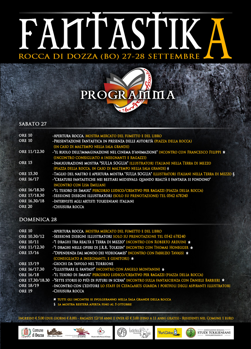 Avevamo già accennato a una manifestazione tolkieniana a fine settembre. Organizzata dalla Fondazione Dozza Città d’Arte, fortemente voluta dall’amministrazione locale con il patrocinio del comune di Dozza e sotto il coordinamento di Ivan Cavini, noto artista e direttore creativo del Greisinger Museum, la manifestazione Fantastika che si terrà nella rocca di Dozza dal 27 al 28 settembre, ha tutto le carte in regola per essere un successo. E l’Associazione romana studi Tolkieniani ha ricevuto la direzione artistica delle mostre dedicate a J.R.R. Tolkien. A 30 km da Bologna, Fantastika si pone l’obiettivo di esplorare a 360 gradi il mondo del fantastico.