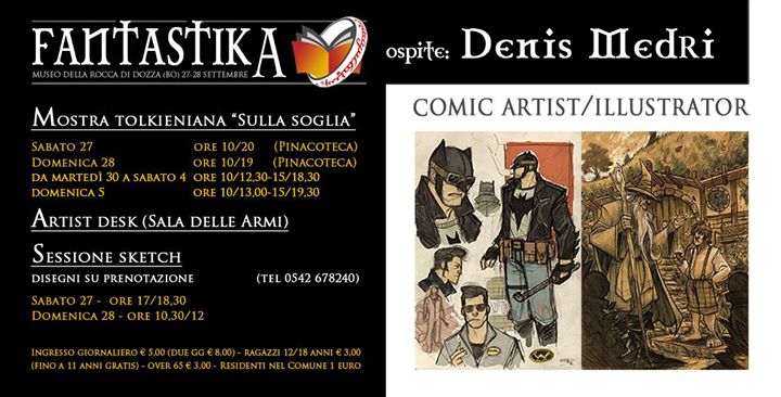 Dal 1996 al 1999 ha svolto anche l’attività di coordinamento artistico per la casa editrice Stratelibri di Milano, collaborando alla realizzazione di vari moduli di gioco, con illustrazioni sia di copertina che interne del Manuale di gioco di ruolo per Il Signore degli Anelli (Girsa), ma anche per Stormbringer, Fantasy Warriors e altri). Sarà lui a inaugurare il 27 settembre le mostre che rimarranno aperte nella Rocca di Dozza fino al 5 ottobre. Domenica 28, nella sala grande alle 16, l’artista incontrerà il pubblico per «Illustrare il Fantasy», mentre alcuni momenti saranno dedicati alle sessioni di sketch. Affiancheranno il maestro tolkieniano altri artisti d’eccezione, ancora tutti non svelati, tra cui però spiccano Denis Medri e Maria Distefano. «Ho sempre voluto fare il disegnatore di fumetti», ha detto Denis Medri nell’intervista rilasciata all’ArsT. «… grazie a un viaggio al Festival della BD di Angouleme (il più importante festival sul fumetto in Europa) ho provato a propormi ed entrare in quel mondo. Da lì ho iniziato a fare questo lavoro da professionista, collaborando con vari editori, non solo nell’ambito del fumetto, tra Francia, Italia e Stati Uniti». La sua carriera è di tutto rispetto, visto che è giunto a pubblicare albi sui supereroi per la Marvel e in Italia il fumetto Dragonero per la prestigiosa Sergio Bonelli Editore.